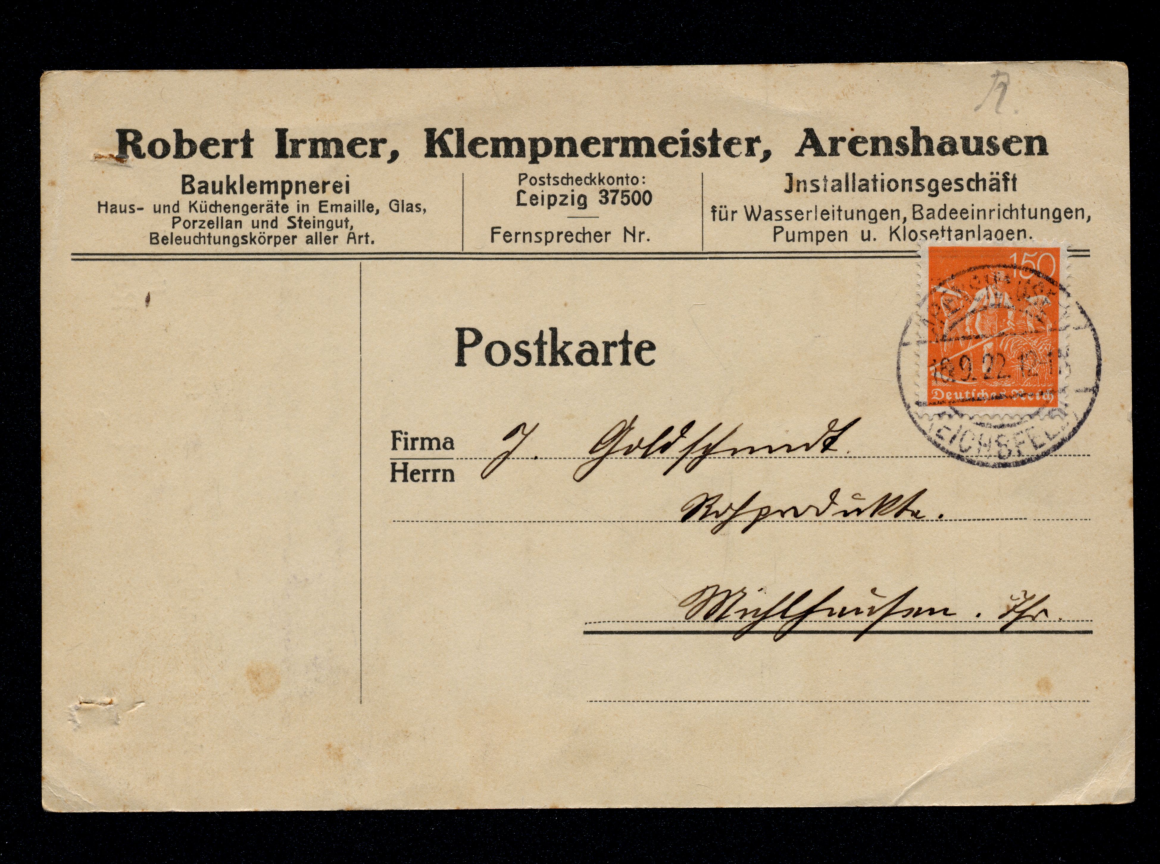 Ort Arenshausen Motive Robert Irmer, Klempnermeister Format groß Jahr 1922 Verlag - Bestell- oder Individualnummer - Versanddatum 16.09.1922