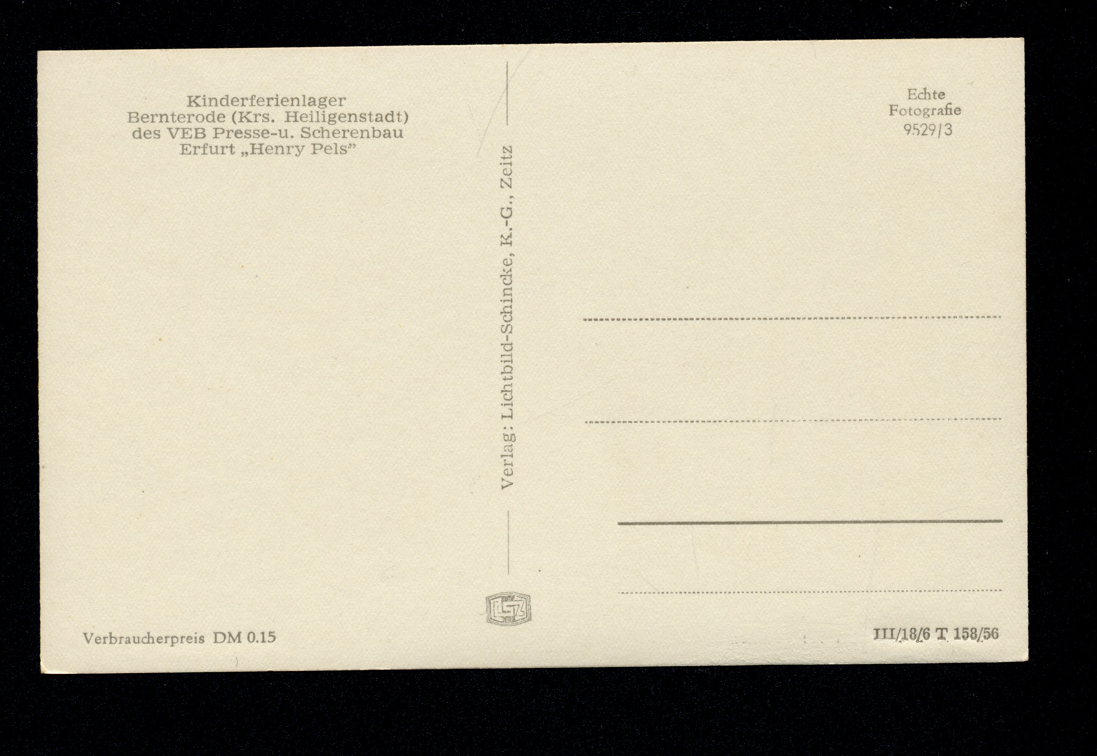 Ort Bernterode (bei Heilbad Heiligenstadt) Motive Kinderferienlager des VEB Presse-u. Scherenbau Erfurt ''Henry Pels'' Format klein Jahr 1956 Verlag Schincke, Zeitz (Lichtbild-Schincke KG) Bestell- oder Individualnummer III/18/6 T 158/56 9529/3