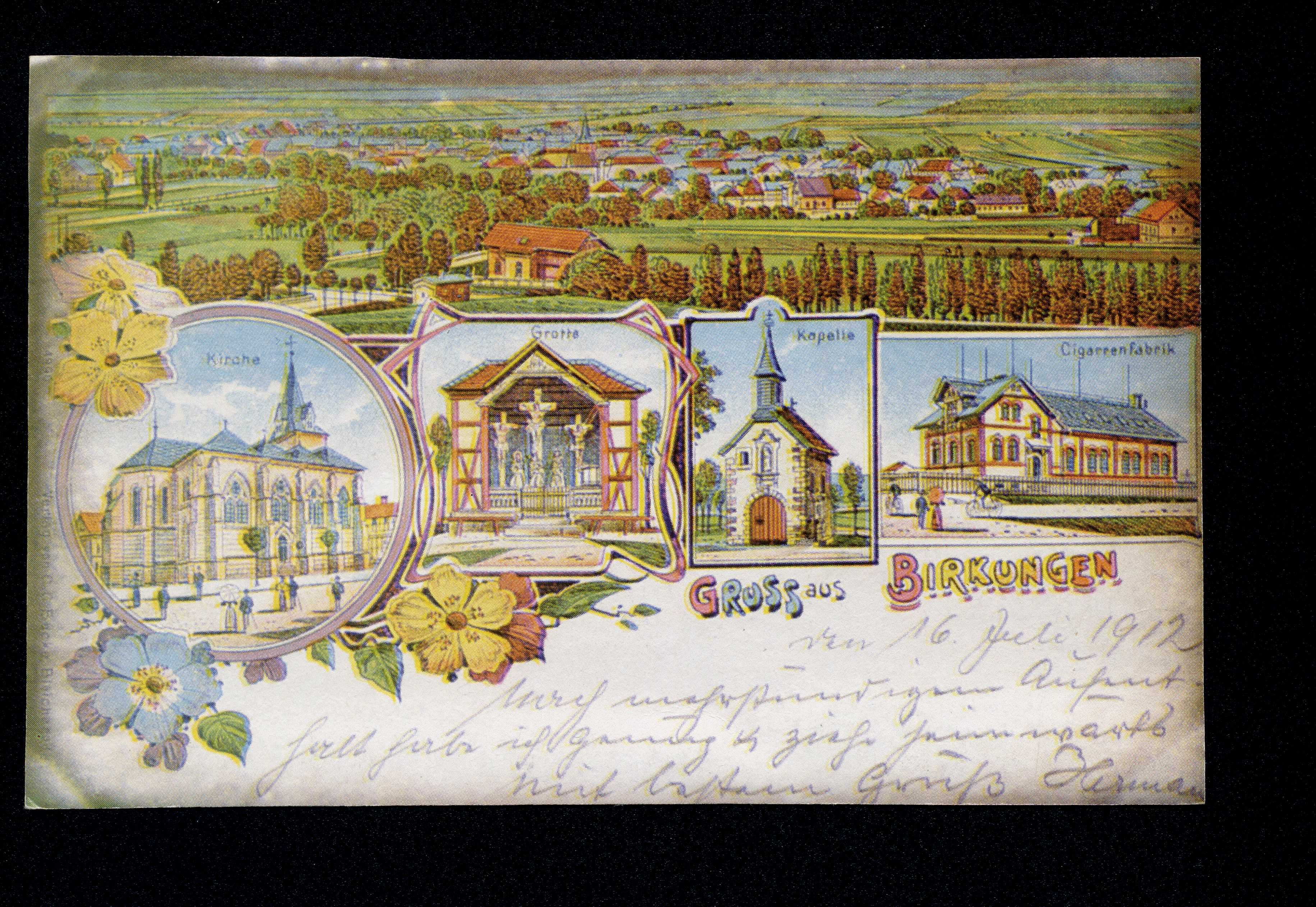 Ort Birkungen Beschreibung Nachdruck Motive Panorama Kirche Grotte Kapelle Cigarrenfabrik Format klein Jahr 1912 Verlag C. C. Becke, Bleicherode Bestell- oder Individualnummer - Versanddatum 16.07.1912 Tags Zigarrenfabrik