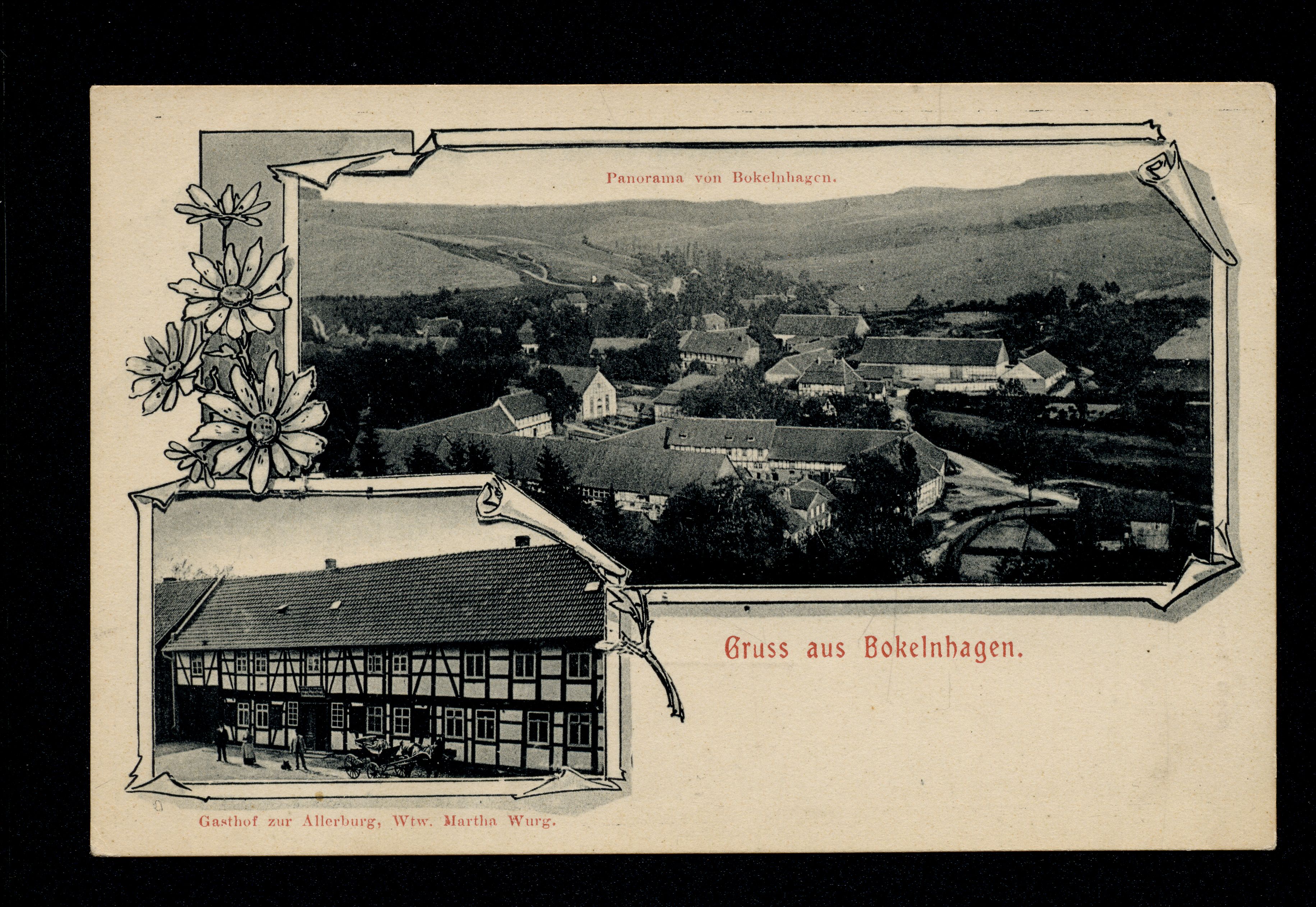 Ort Bockelnhagen Motive Panorama von Bockelnhagen Gasthof zur Allerburg, Wtw. Martha Wurg Format klein Verlag Otto Künemund, Lauterberg a/Harz Bestell- oder Individualnummer 83856 Tags Gasthaus