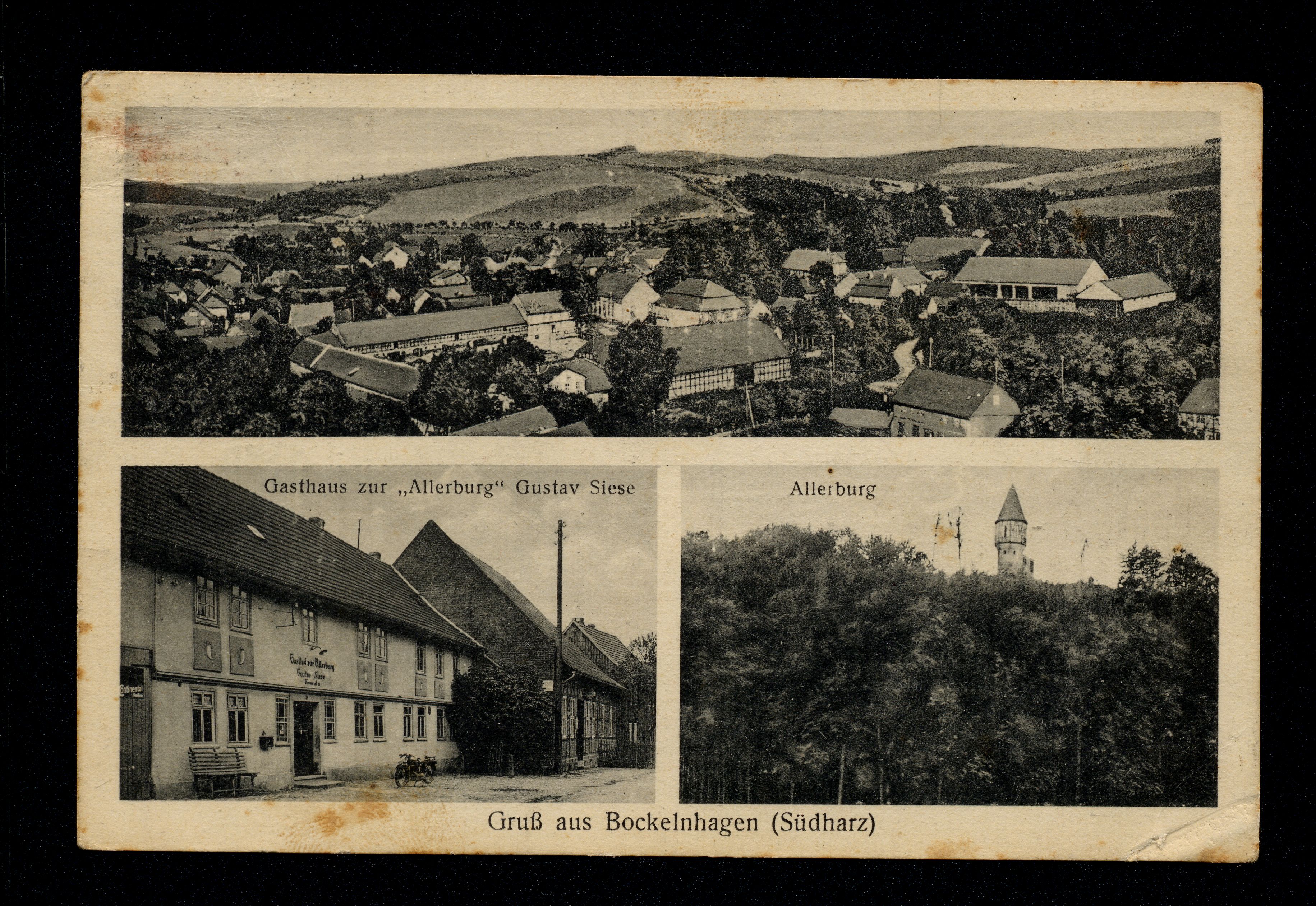 Ort Bockelnhagen Beschreibung Variante "grau" Motive Teilansicht Gasthaus zur ''Allerburg'' Gustav Siese Allerburg Format klein Verlag Otto Künemund, Lauterberg a/Harz Bestell- oder Individualnummer n 40 Tags Gasthaus Burg Allerburg