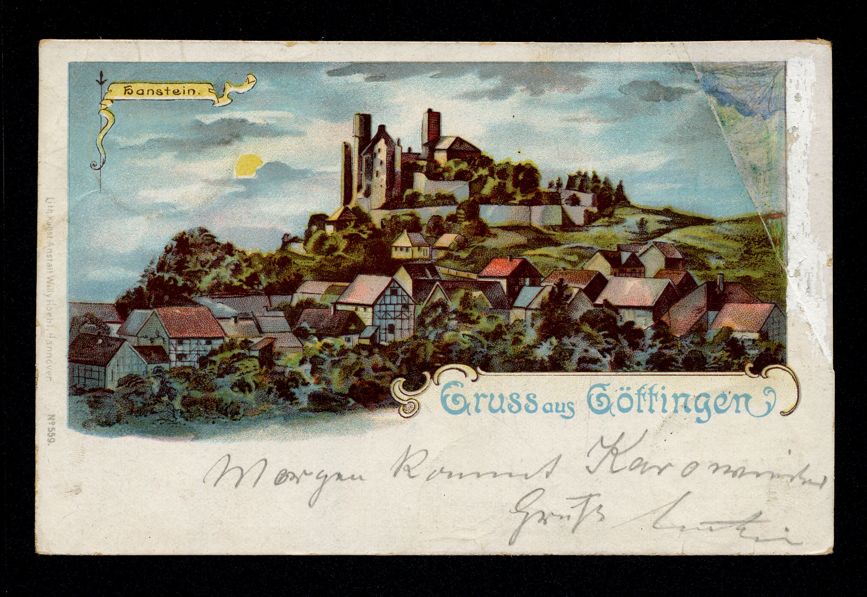 Ort Bornhagen Motive Hanstein Format klein Jahr 1899 Verlag Willy Hoehl, Hannover Bestell- oder Individualnummer No 559 Versanddatum 15.09.1899 Tags Burg Hanstein