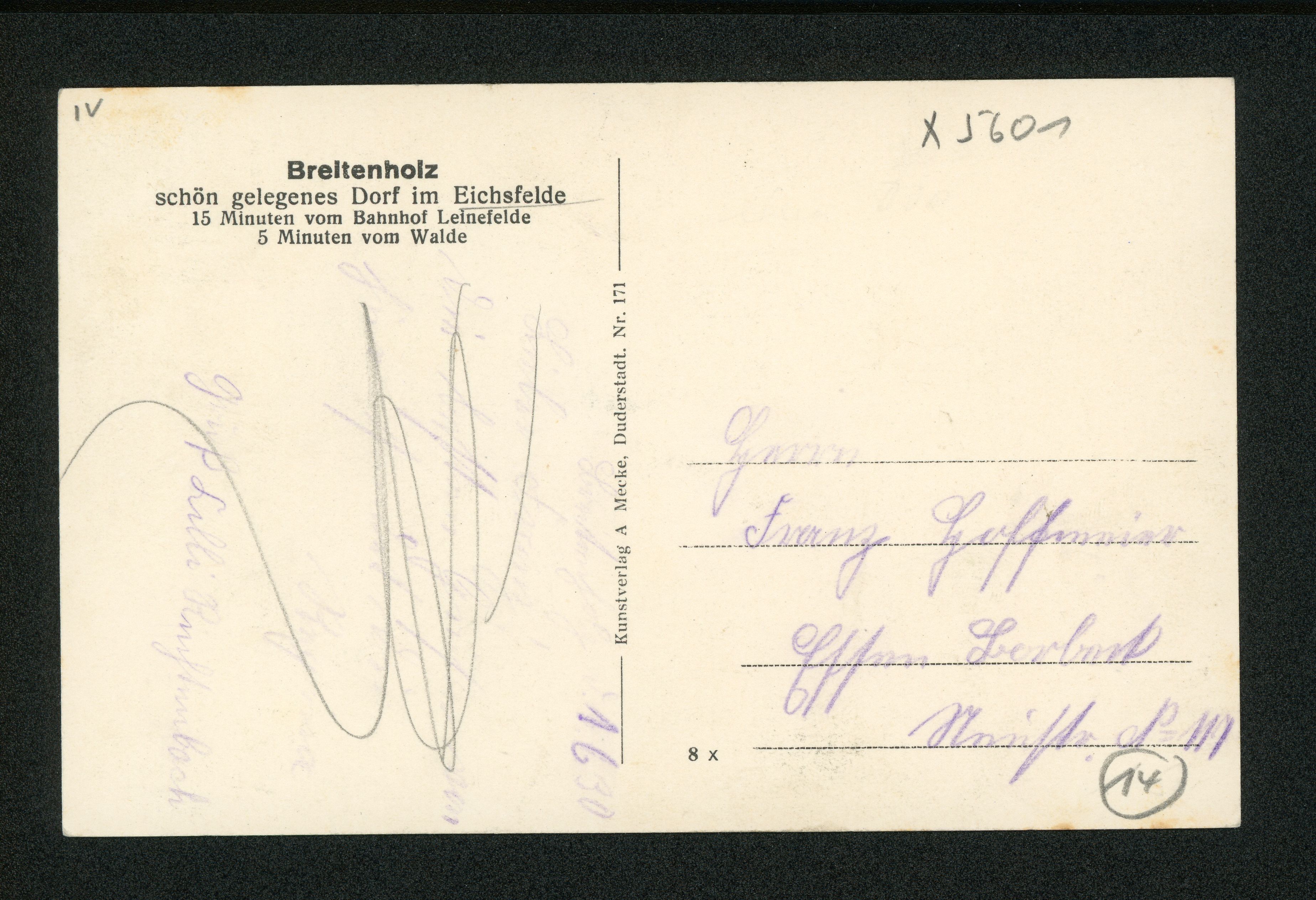 Ort Breitenholz Motive Uralte Linde Gemeinde=Gasthaus zur Linde, Inh. Franz Mühlhaus Format klein Verlag Aloys Mecke, Duderstadt Bestell- oder Individualnummer Nr. 171 8 x Tags PKW Zur Linde Landpoststempel