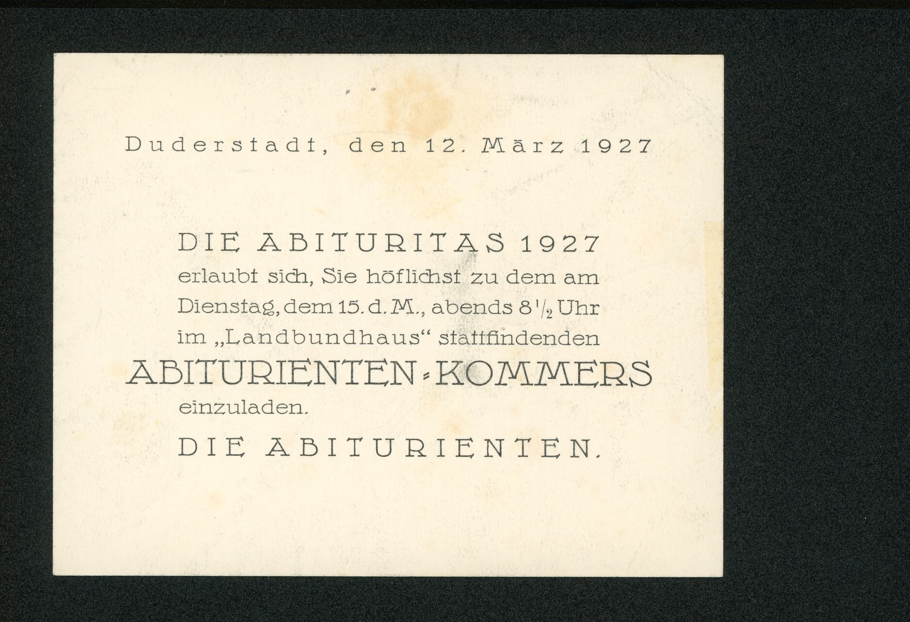 Ort Duderstadt - Belege Motive Abiturienten=Kommers Abituritas 1927 Format Sonderformat Jahr 1927 Verlag - Bestell- oder Individualnummer - Tags Abitur Matura Studentika Landbundhaus