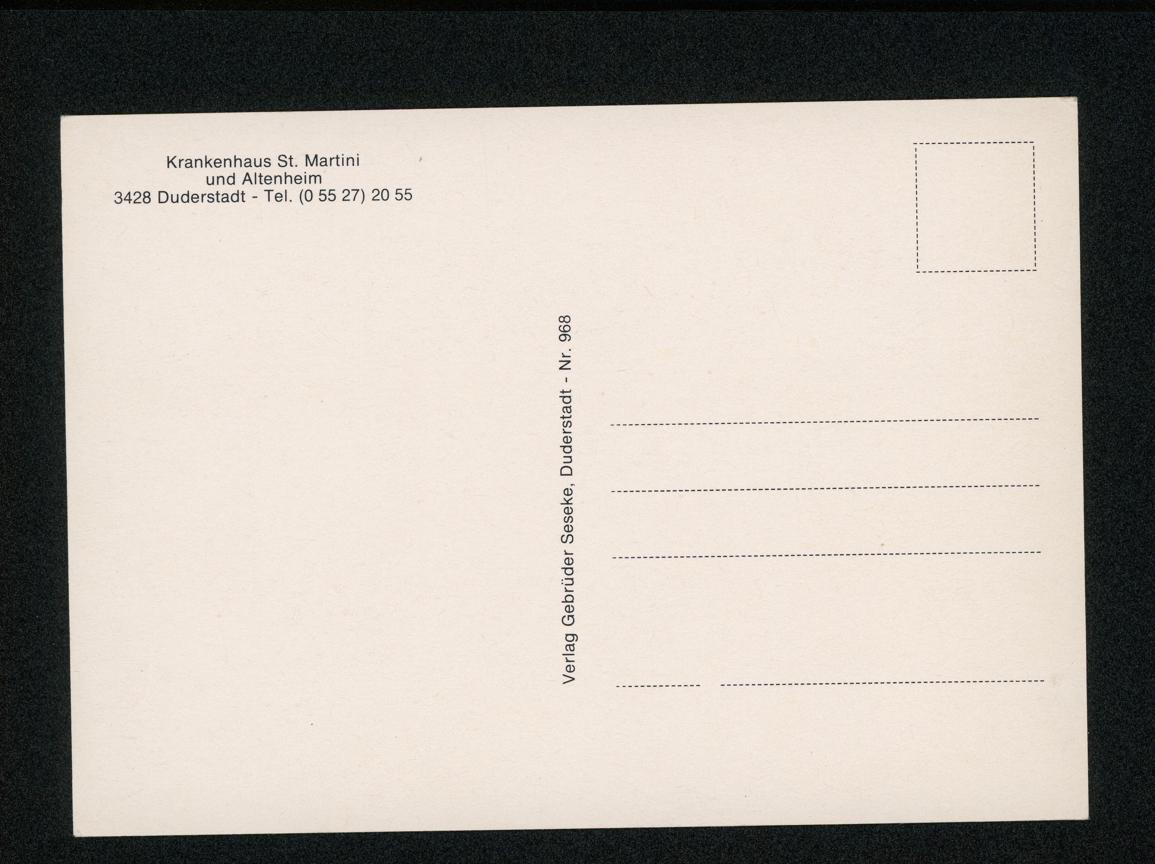 Ort Duderstadt Beschreibung Variante "Rückseite" Motive Krankenhaus St. Martini und Altersheim Format groß Verlag Gebrüder Seseke, Duderstadt Bestell- oder Individualnummer Nr. 968