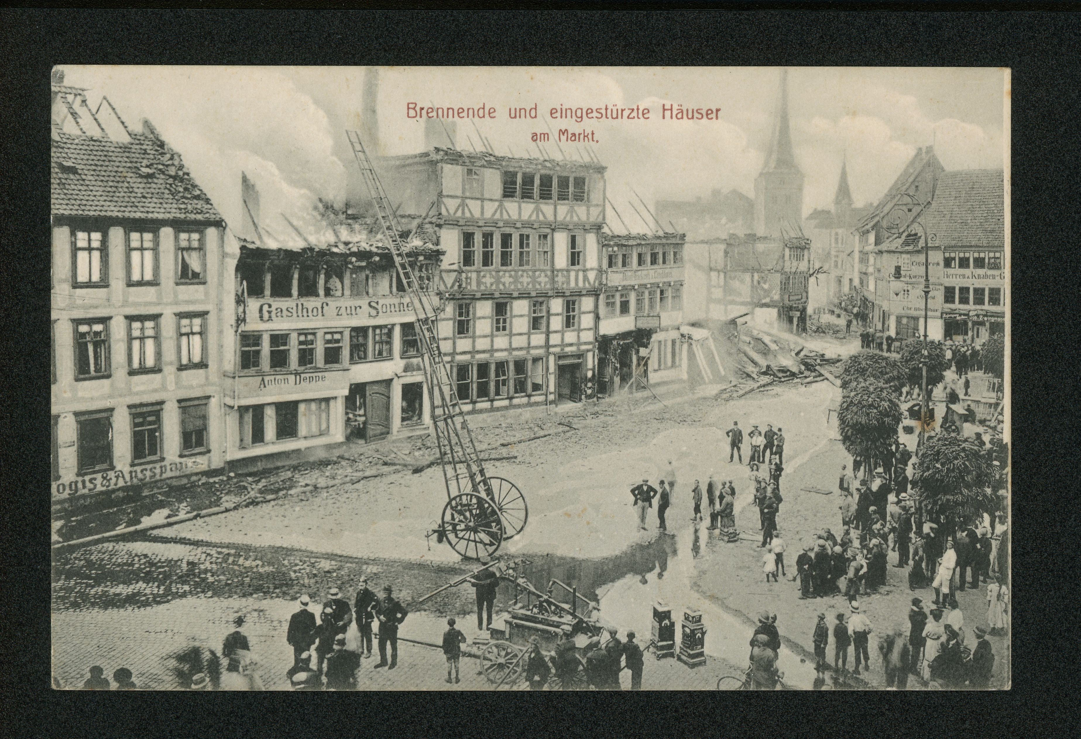 Ort Duderstadt Motive Brennende und eingestürzte Häuser am Markt Format klein Jahr 1911 Verlag H. Richwien, Duderstadt Bestell- oder Individualnummer 11359 Tags Gasthof zur Sonne Anton Deppe Gasthof zum Stern Joseph Lehne Westerturm Colonial & Porzellan Chr. Oberthür Dampfbäckerei & Conditorei Feuerwehr Pferdemarkt Unglück