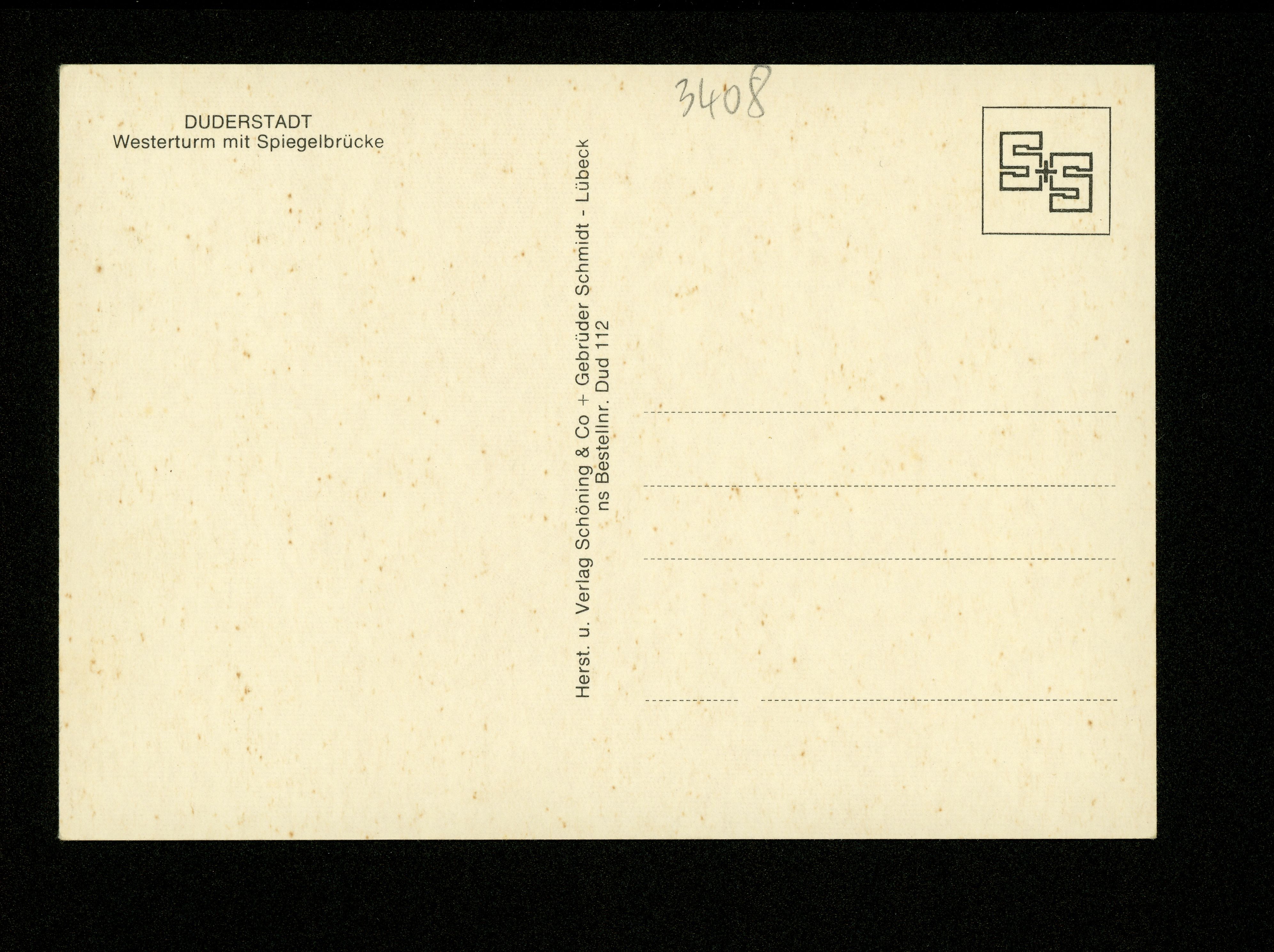 Ort Duderstadt Motive Westerturm mit Spiegelbrücke Format groß Verlag Chr. Schöning & Co., Lübeck (+ Gebrüder Schmidt) Bestell- oder Individualnummer ns Bestellnr. Dud 112 Tags Edeka Apotheke