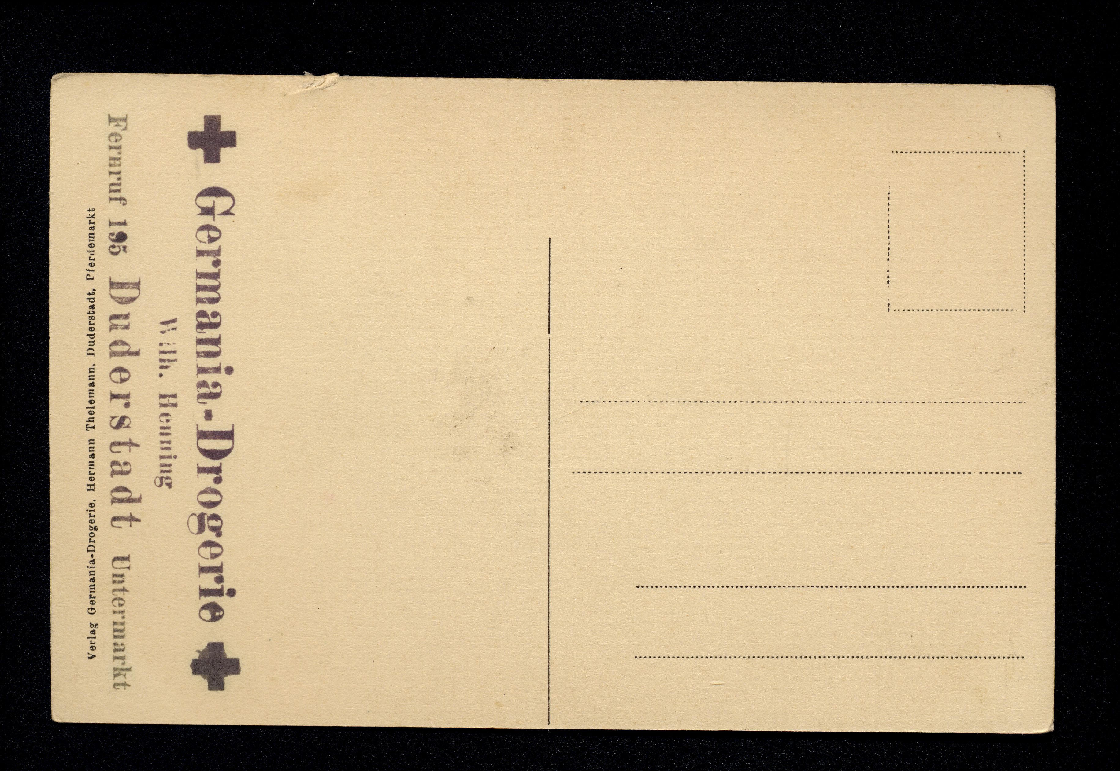 Ort Duderstadt Beschreibung Variante u.a. "farbig" Motive Germania-Drogerie Hermann Thelemann Format klein Verlag Hermann Thelemann, Duderstadt Bestell- oder Individualnummer - Tags Wilh. Henning Markt-Apotheke Apotheke Gasthof zur Sonne Anton Deppe