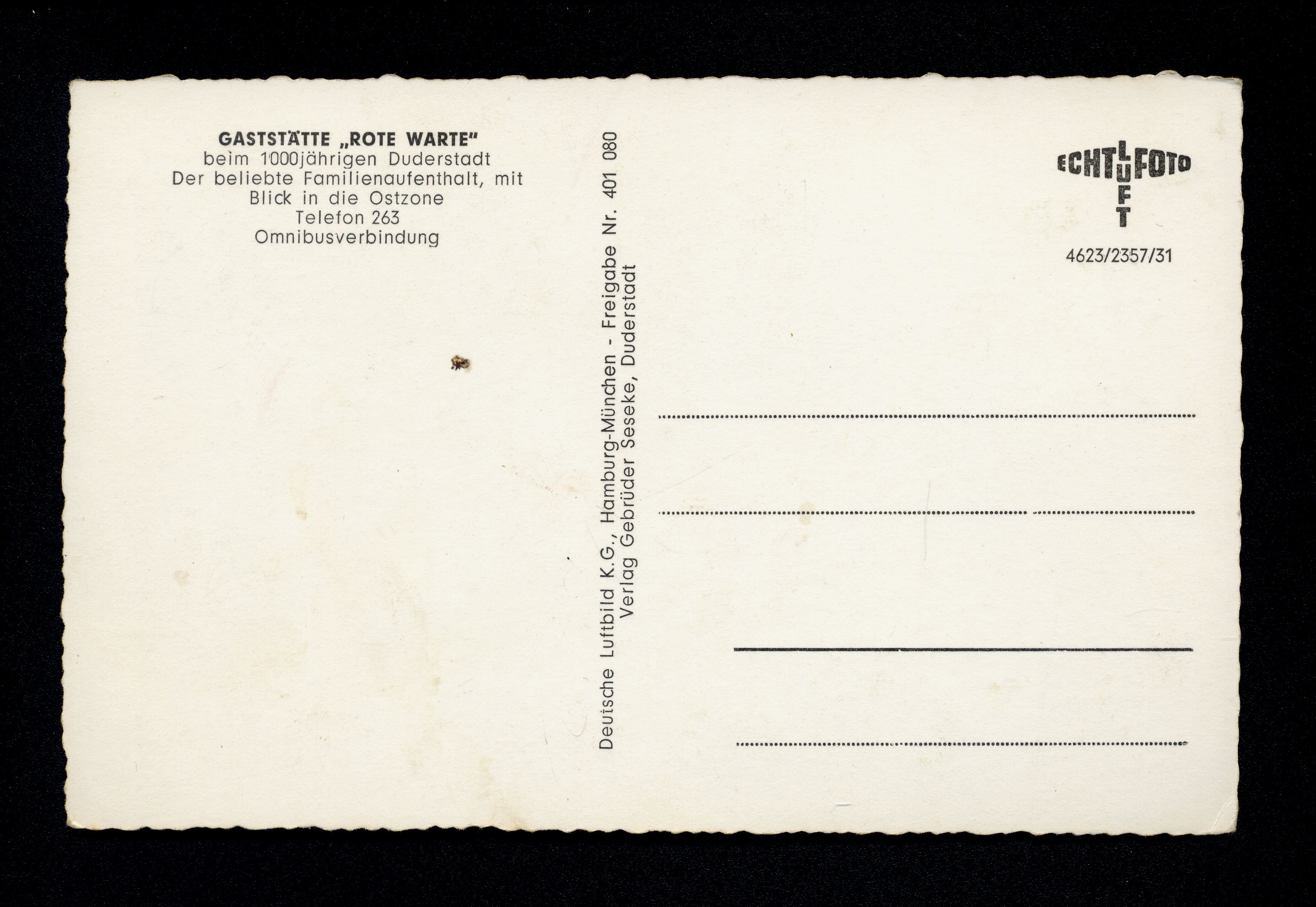 Ort Duderstadt Motive Gaststätte ''Rote Warte'' Format klein Verlag Deutsche Luftbild K.G., Hamburg Bestell- oder Individualnummer 4623/2357/31 Tags Luftbild Gasthaus