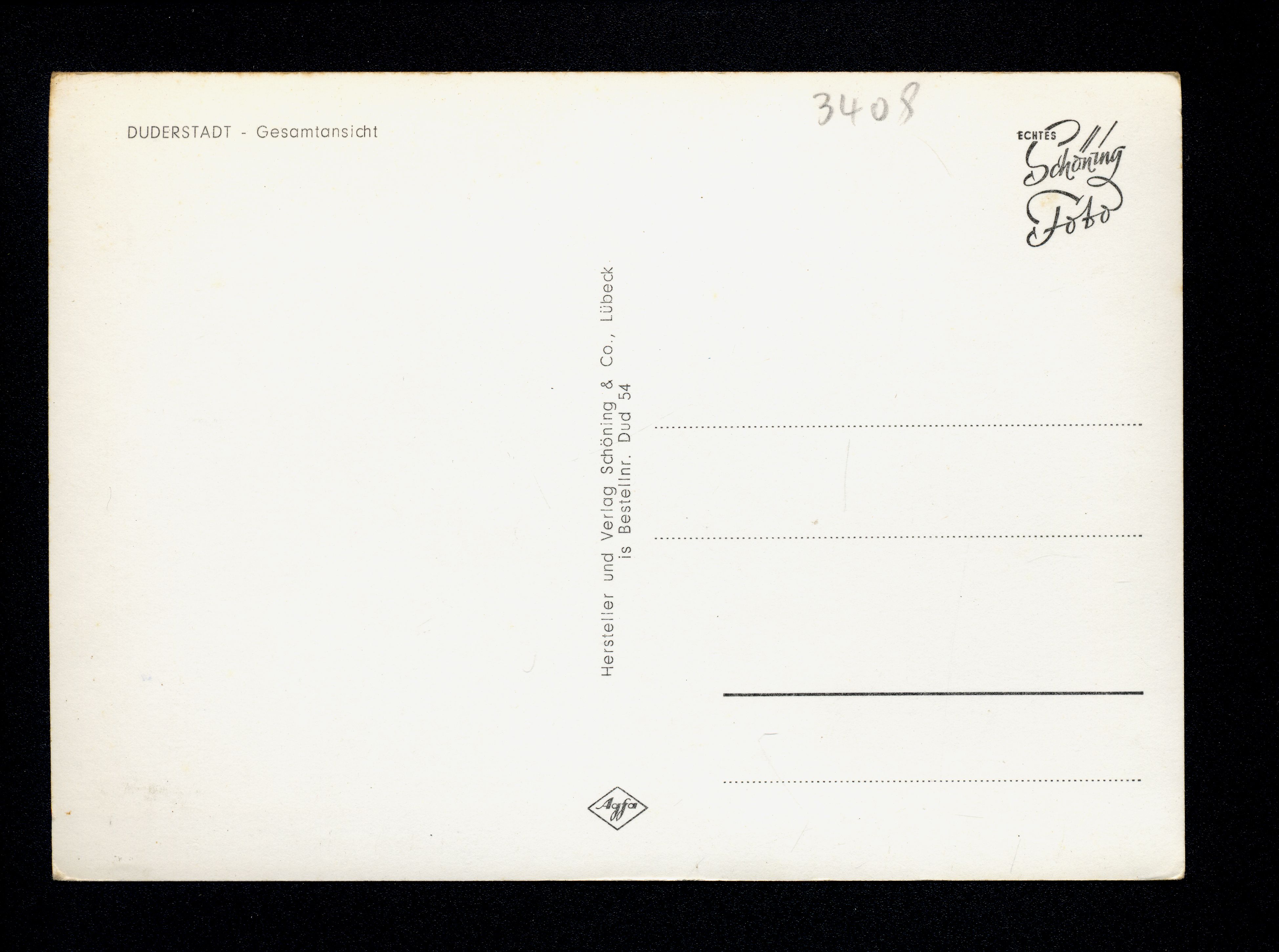 Ort Duderstadt Motive Gesamtansicht Format groß Verlag Chr. Schöning & Co., Lübeck (+ Gebrüder Schmidt) Bestell- oder Individualnummer is Bestellnr. Dud 54