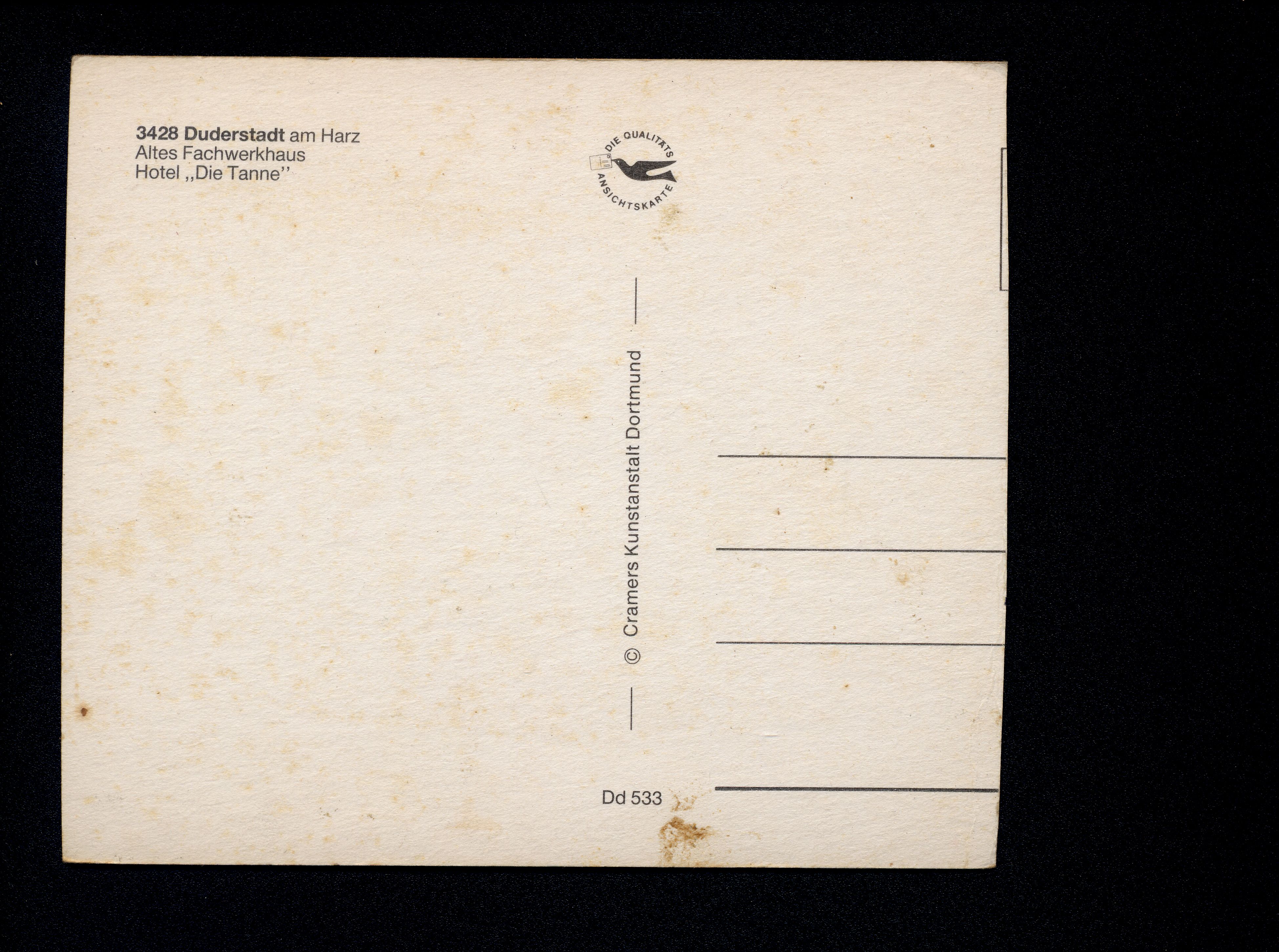 Ort Duderstadt Motive Altes Fachwerkhaus Hotel ''Die Tanne'' Format groß Verlag Cramers Kunstanstalt, Dortmund Bestell- oder Individualnummer Dd 533 Tags Hotel zur Tanne