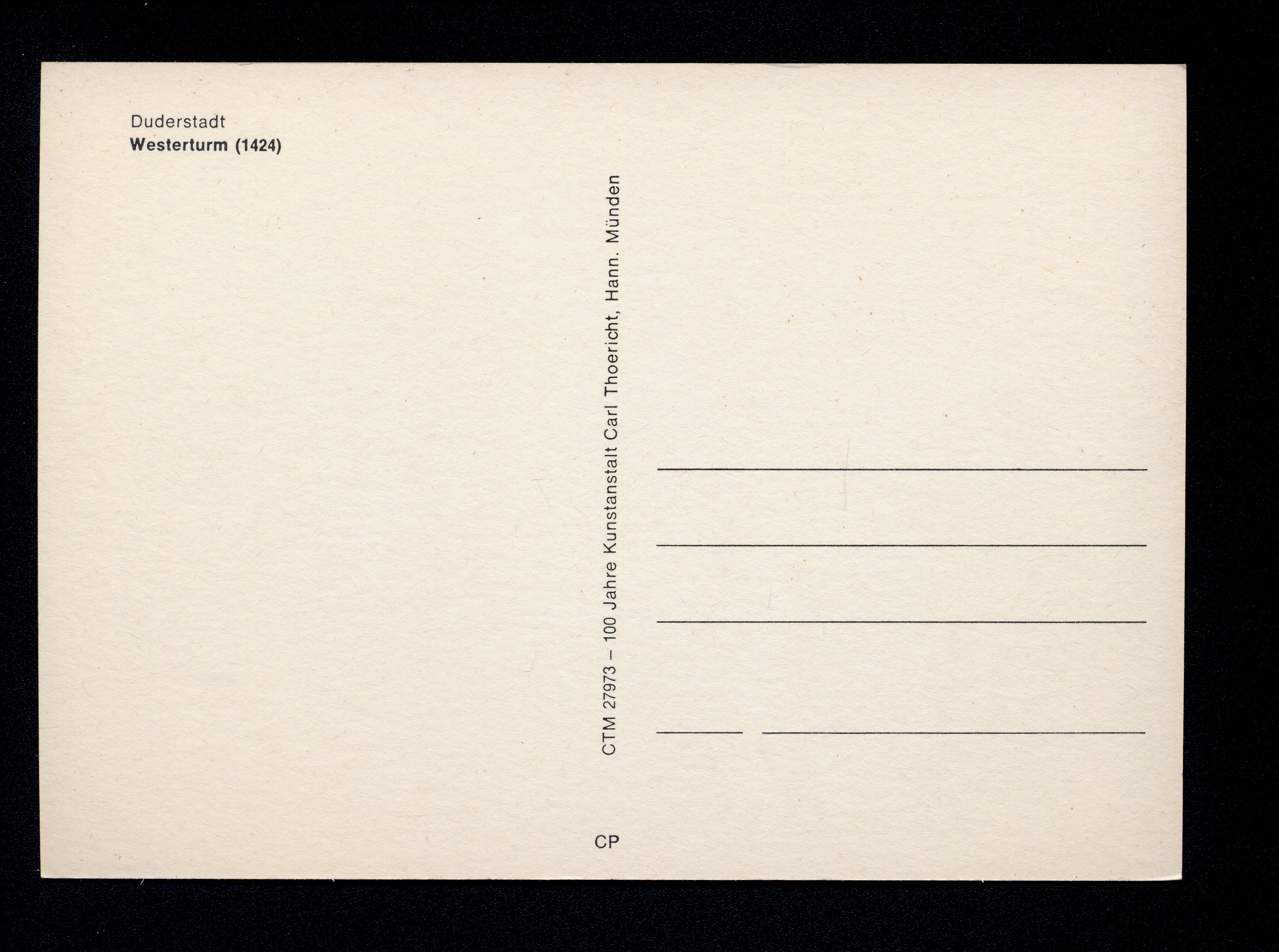 Ort Duderstadt Motive Westerturm Format groß Verlag Carl Thoericht, Hann.-Münden (Karl Thoericht) (CTM) Bestell- oder Individualnummer CTM 27973 CP