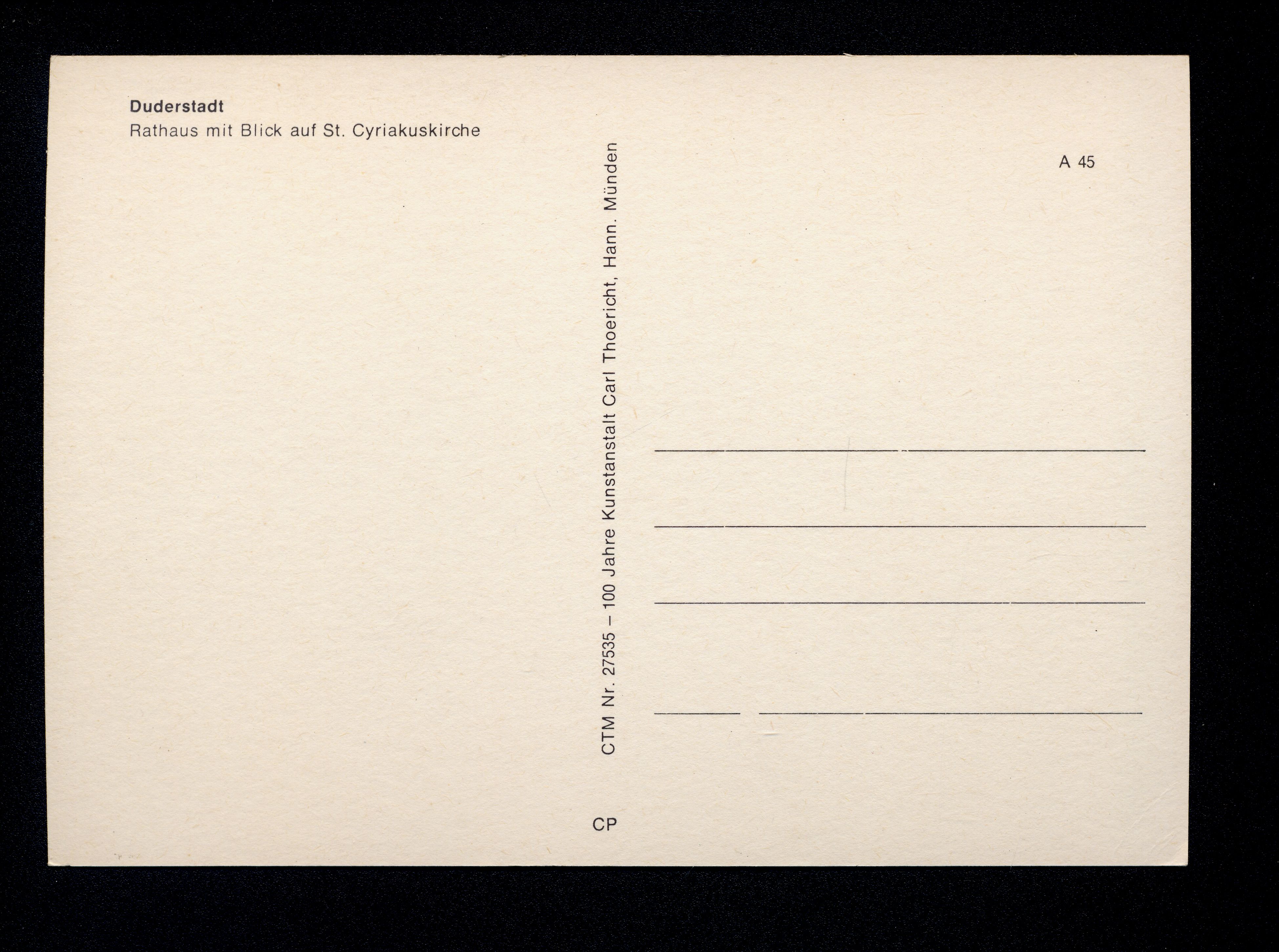 Ort Duderstadt Motive Rathaus mit Blick auf St. Cyriakuskirche Format groß Verlag Carl Thoericht, Hann.-Münden (Karl Thoericht) (CTM) Bestell- oder Individualnummer CTM Nr. 27535 CP A 45