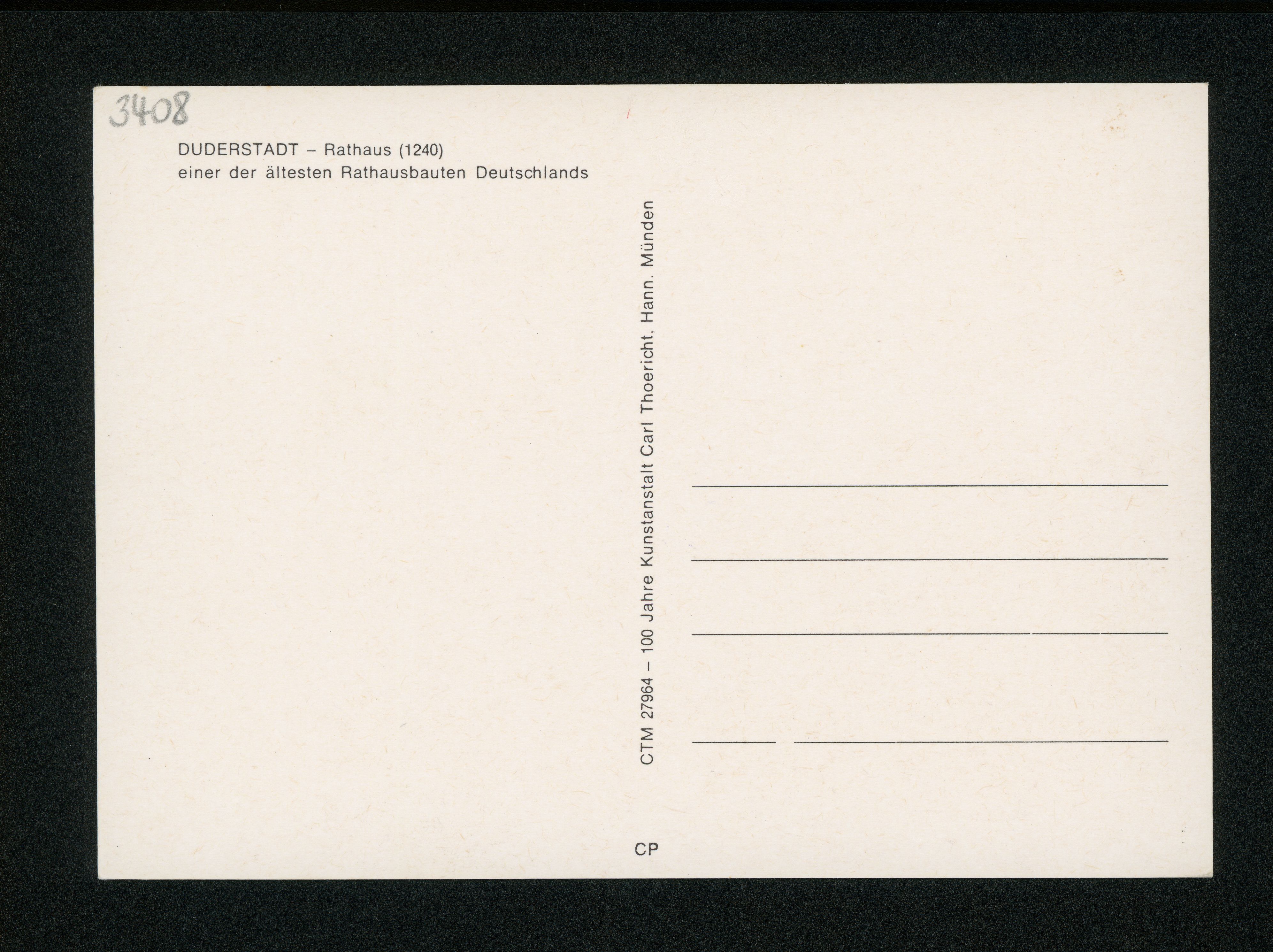Ort Duderstadt Motive Rathaus Format groß Verlag Carl Thoericht, Hann.-Münden (Karl Thoericht) (CTM) Bestell- oder Individualnummer CTM 27964 CP
