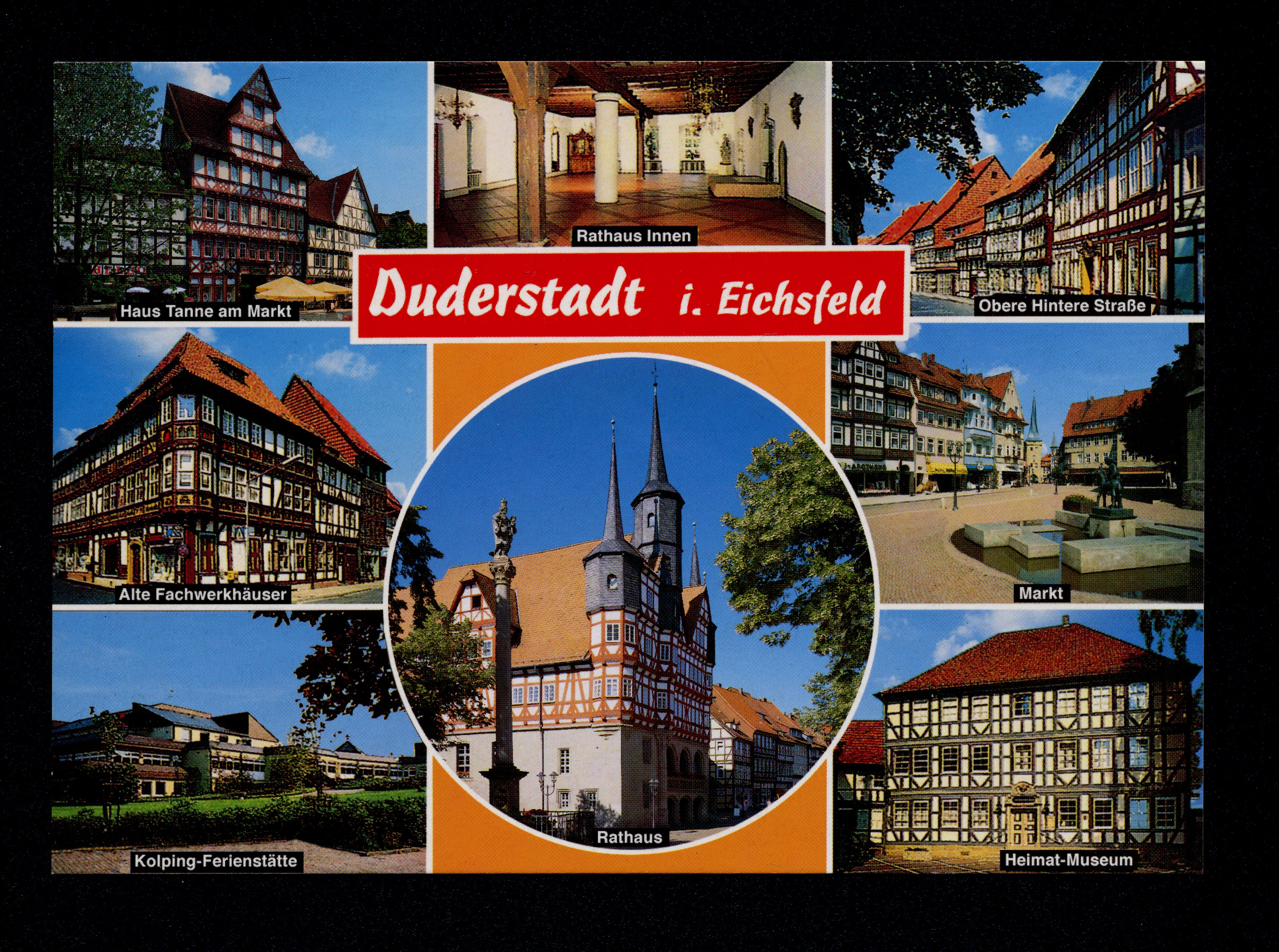 Ort Duderstadt Motive Haus Tanne am Markt Rathaus Innen Obere Hintere Straße Alte Fachwerkhäuser Kolping-Ferienstätte Rathaus Heimatmuseum Markt Format groß Jahr 1998 Verlag type art satz & grafik, Dortmund Bestell- oder Individualnummer Dd 105 98/2 Tags Altes Fachwerkhaus Glaese Hinterstraße Kolping Familienferienzentrum Kolping-Familienferienstätte Ferienparadies Pferdeberg Heimatmuseum Gerblingerode Hotel zur Tanne