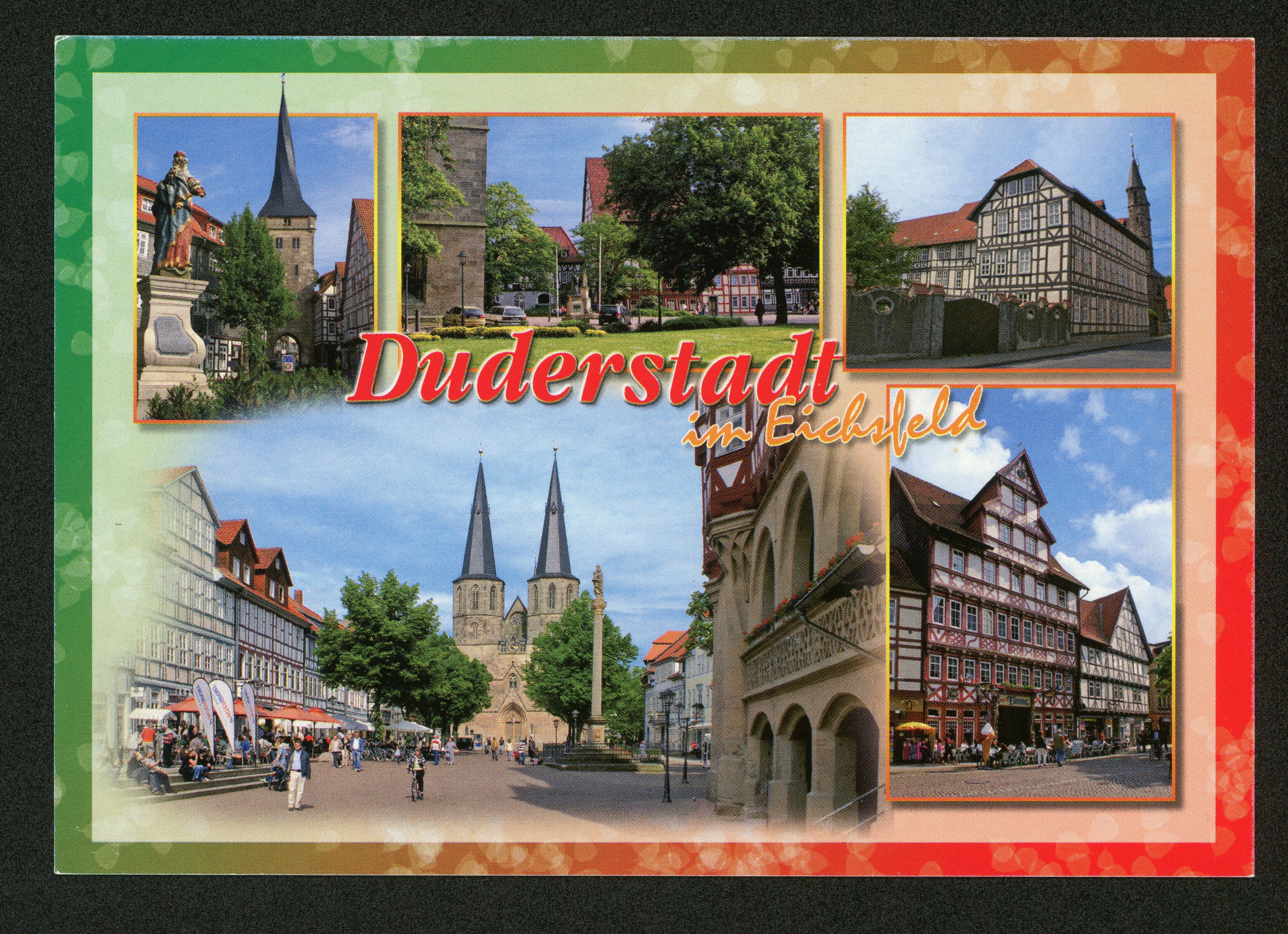 Ort Duderstadt Motive Hotel zur Tanne Westertor mit Madonna im Lindenzaun Ursulinenkloster von der Neutorstraße aus gesehen mit Liebfrauenkirche Mariensäule und Rathaus St. Cyriakus-Kirche und Blick auf das Tabaluga Haus Format groß Verlag Decard Verlag AG, Weinfelden Schweiz Bestell- oder Individualnummer 3-DUD-993 7612761300027