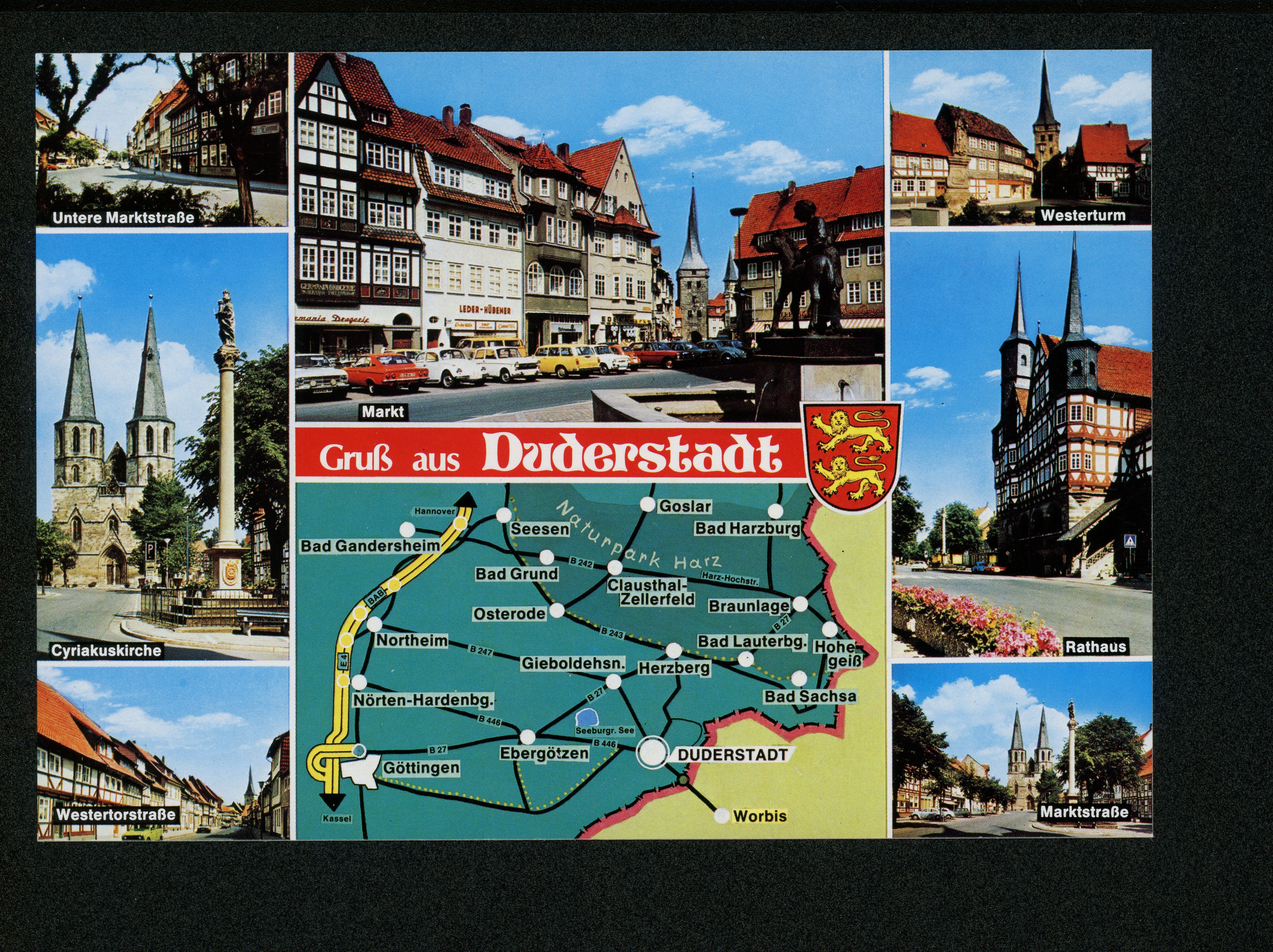 Ort Duderstadt Motive Untere Marktstraße Cyriakuskirche Westertorstraße Markt Westerturm Rathaus Marktstraße Landkarte Format groß Jahr 1989 Verlag Cramers Kunstanstalt, Dortmund Bestell- oder Individualnummer Dd 519 89/2 Tags Mariensäule