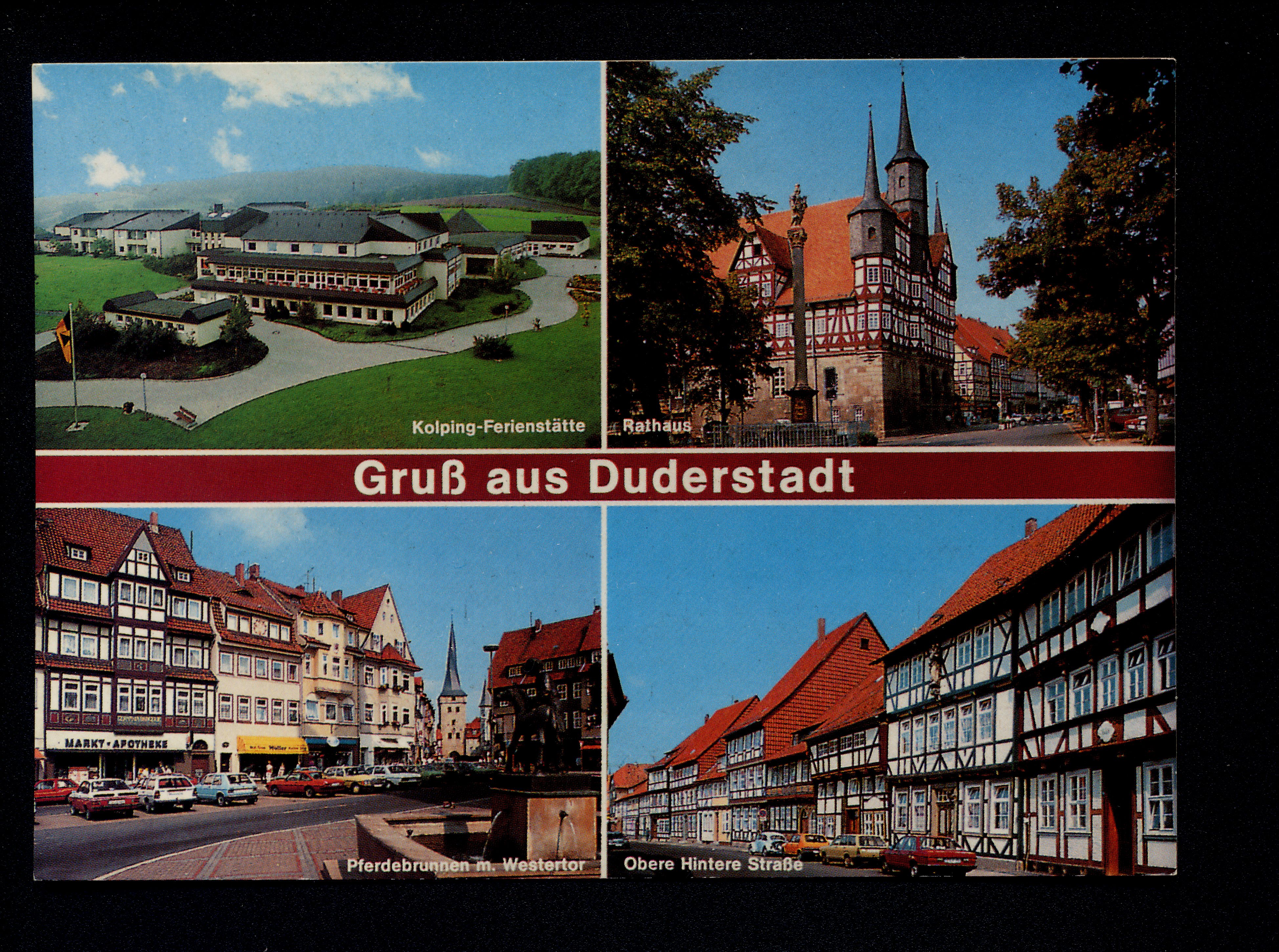 Ort Duderstadt Motive Kolping-Ferienstätte Rathaus Pferdebrunnen mit Westertor Obere Hintere Straße Format groß Verlag - Bestell- oder Individualnummer - Tags Ferienparadies Pferdeberg Kolping Familienferienzentrum Hinterstraße Gerblingerode