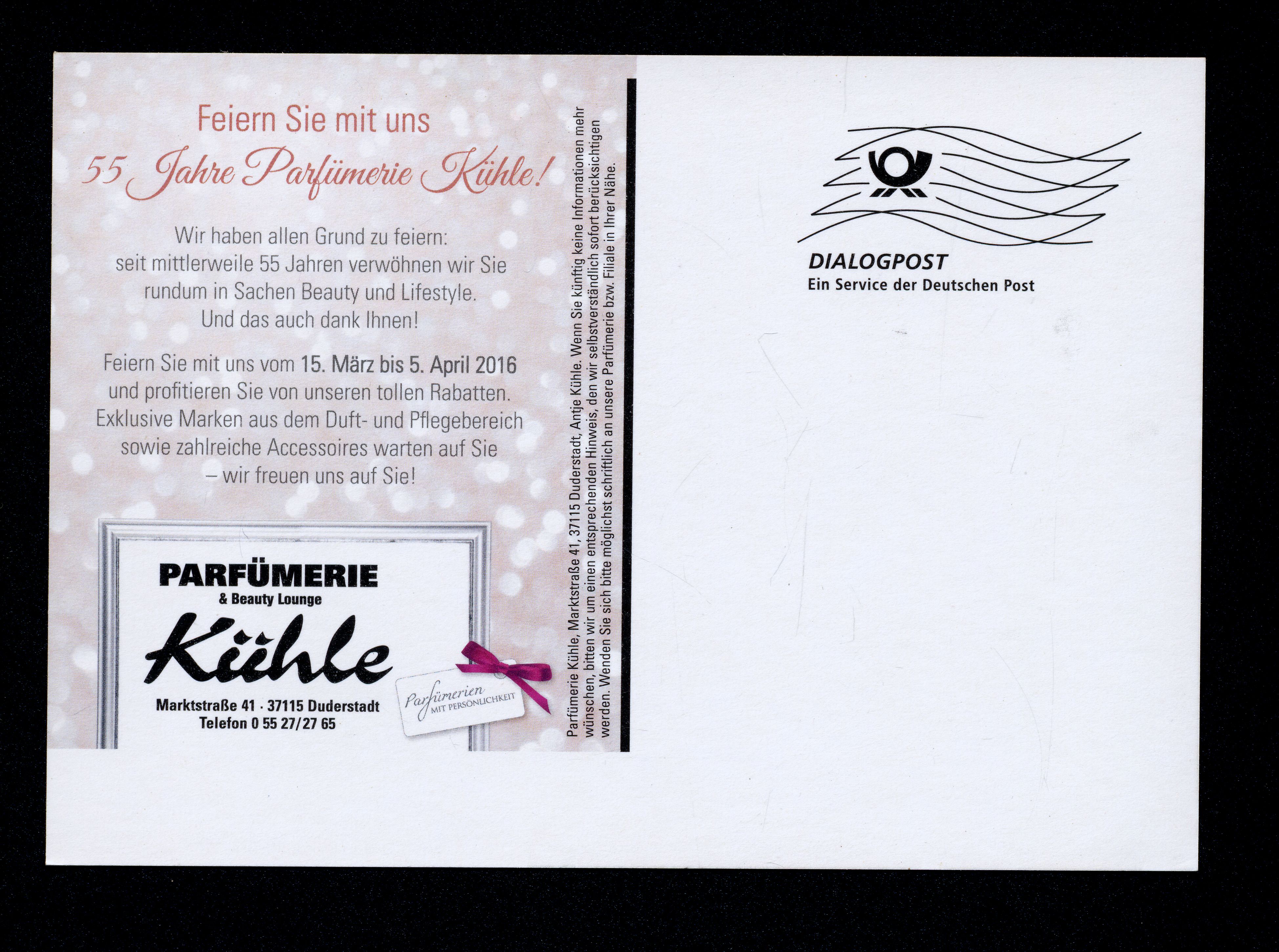 Ort Duderstadt Motive 55 Jahre Parfümerei Kühle Format groß Jahr 2016 Verlag Antje Kühle, Duderstadt Bestell- oder Individualnummer - Tags Gutschein