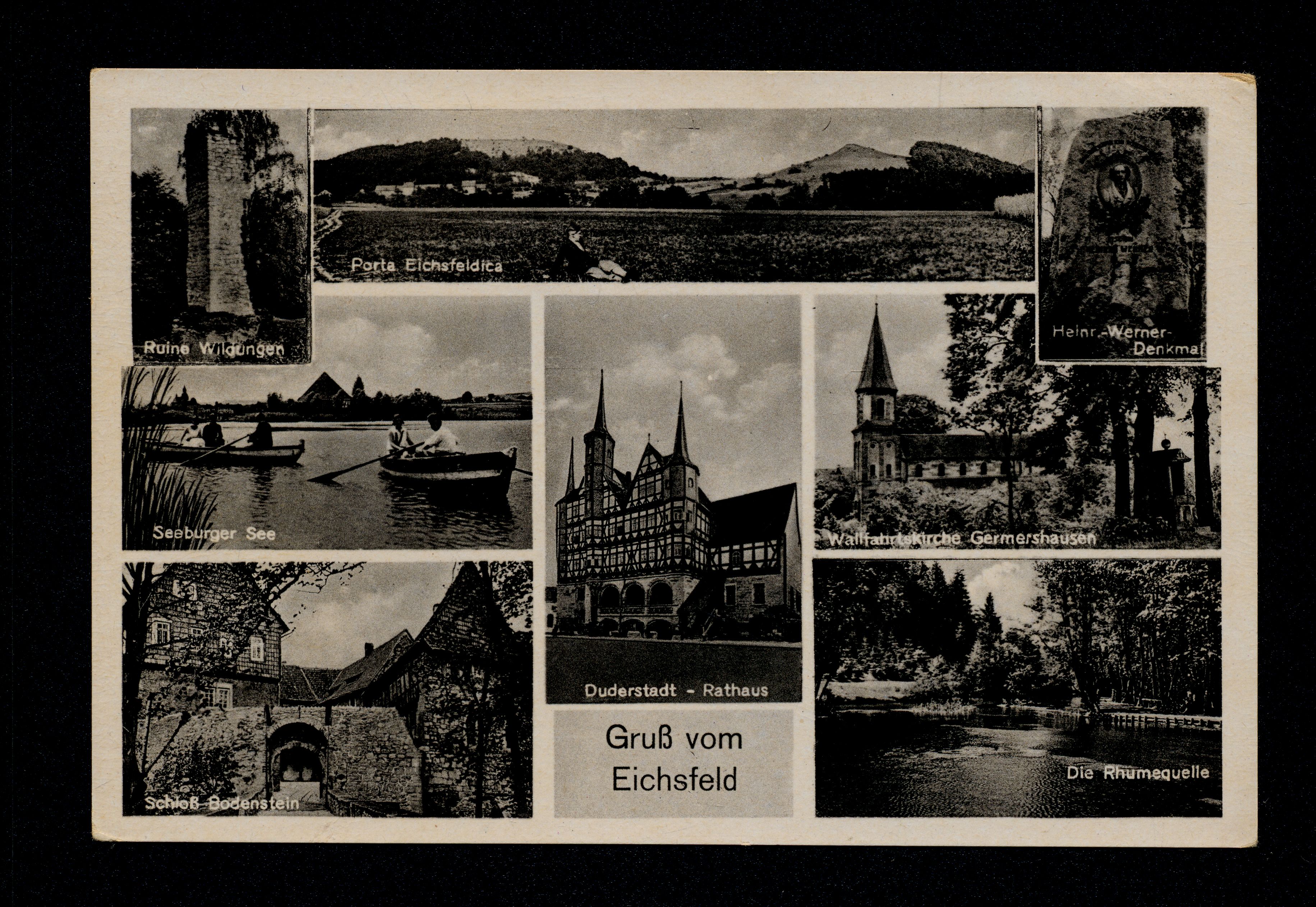 Ort Eichsfeld (allgemein) Motive Ruine Wildungen Porta Eichsfeldica Heinr.-Werner-Denkmal Seeburger See Duderstadt - Rathaus Wallfahrtskirche Germershausen Schloß Bodenstein Die Rhumequelle Format klein Verlag Gebrüder Seseke, Duderstadt Bestell- oder Individualnummer Nr. 108 t 43 Tags Bernshausen Burg Bodenstein Wintzingerode Rhumspringe Seeburg Brehme Sonnenstein Holungen Heinrich Werner-Denkmal Kirchohmfeld