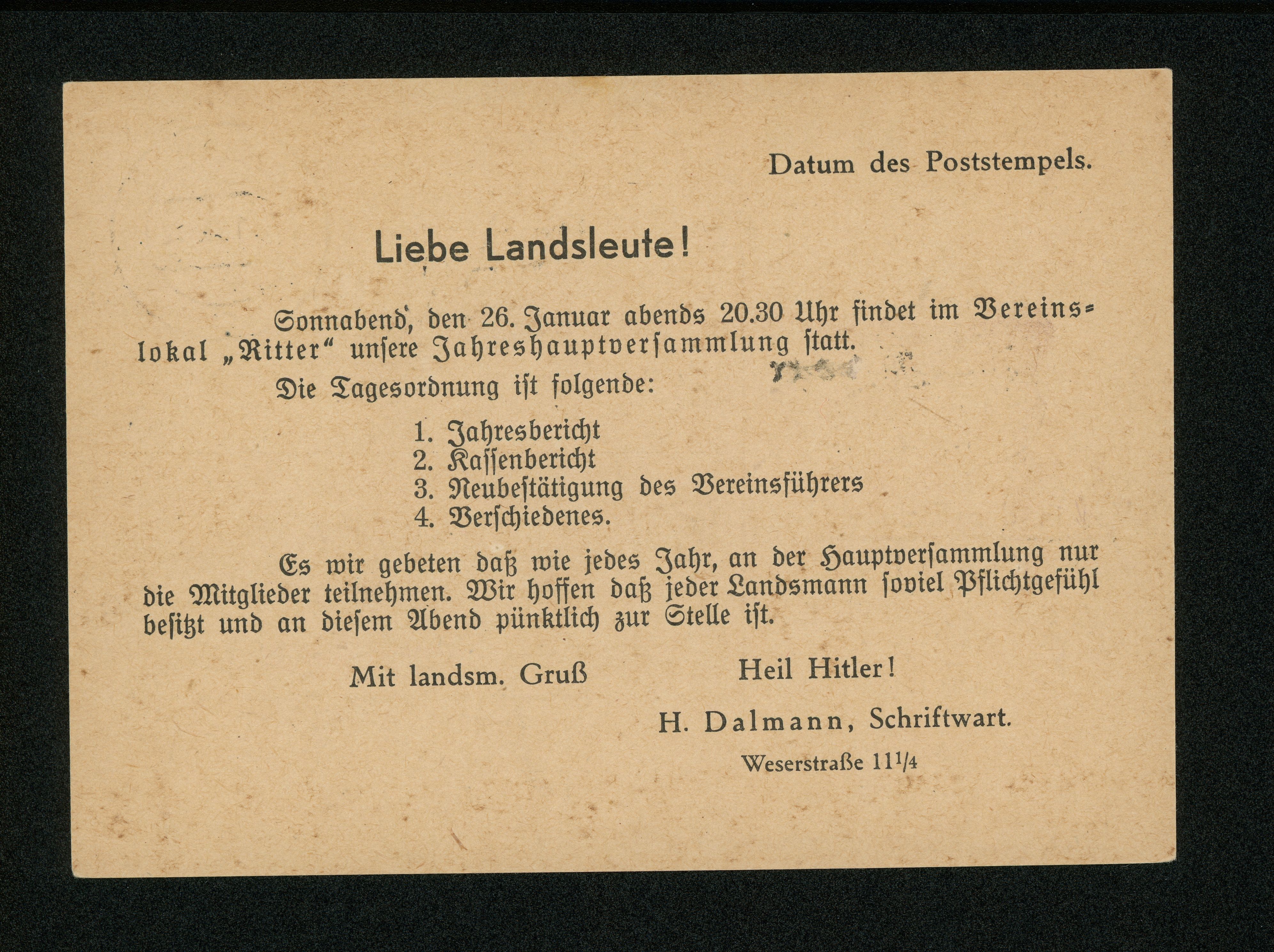 Ort Eichsfeld (allgemein) Motive Einladung zur Jahreshauptversammlung 26.01.1935 im Vereinslokal Gasthaus ''Ritter'', Mittelgasse, Kassel Format groß Jahr 1935 Verlag - Bestell- oder Individualnummer - Versanddatum 23.01.1935 Tags H. Dalmann, Schriftwart