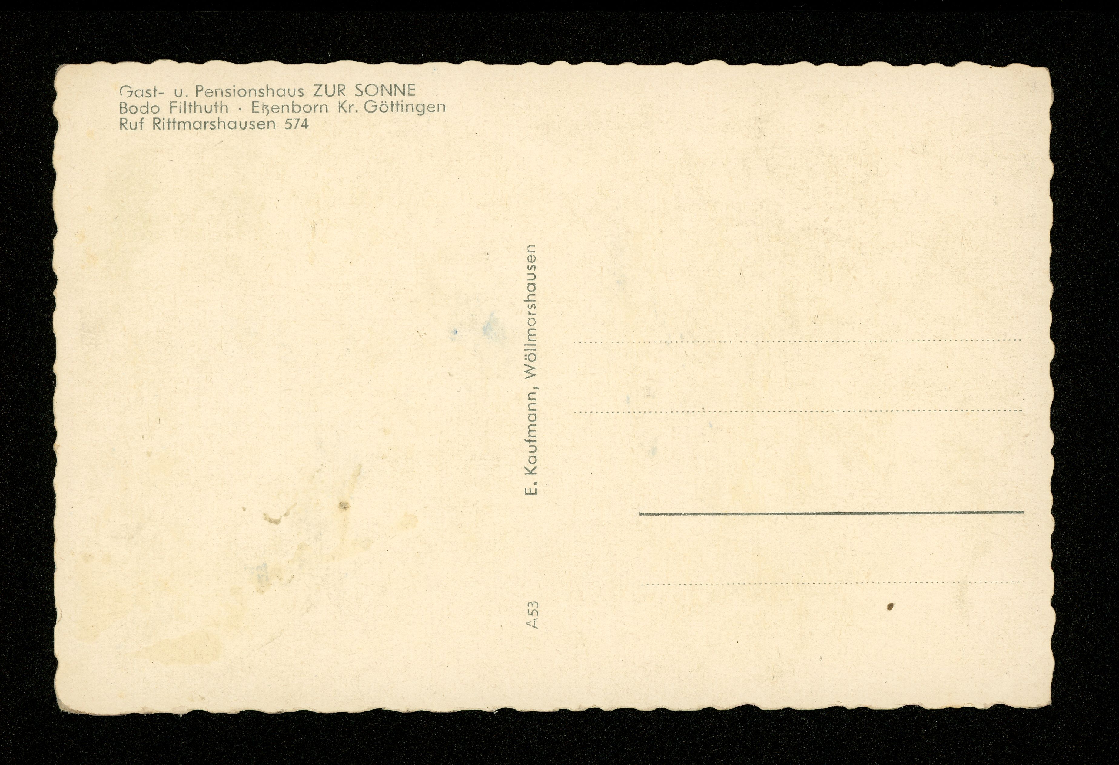 Ort Etzenborn Motive Panorama Gast- u. Pensionshaus ZUR SONNE Bodo Filthuth Format klein Verlag E. Kaufmann, Wöllmarshausen Bestell- oder Individualnummer A53 Tags Gasthaus