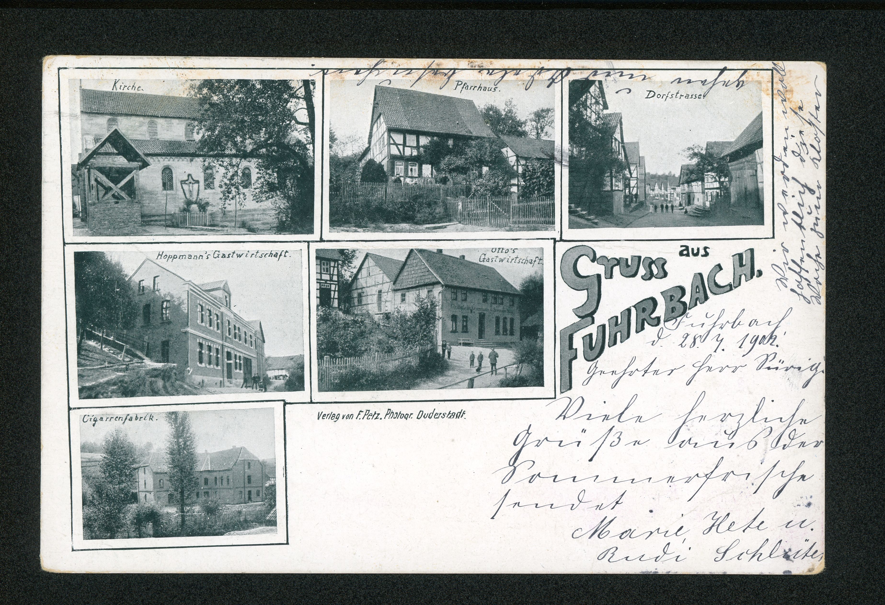 Ort Fuhrbach Motive Kirche Pfarrhaus Dorfstrasse Hoppmann's Gastwirtschaft Otto's Gastwirtschaft Cigarrenfabrik Format klein Jahr 1902 Verlag - Bestell- oder Individualnummer - Versanddatum 28.07.1902 Tags Zigarrenfabrik Gasthaus