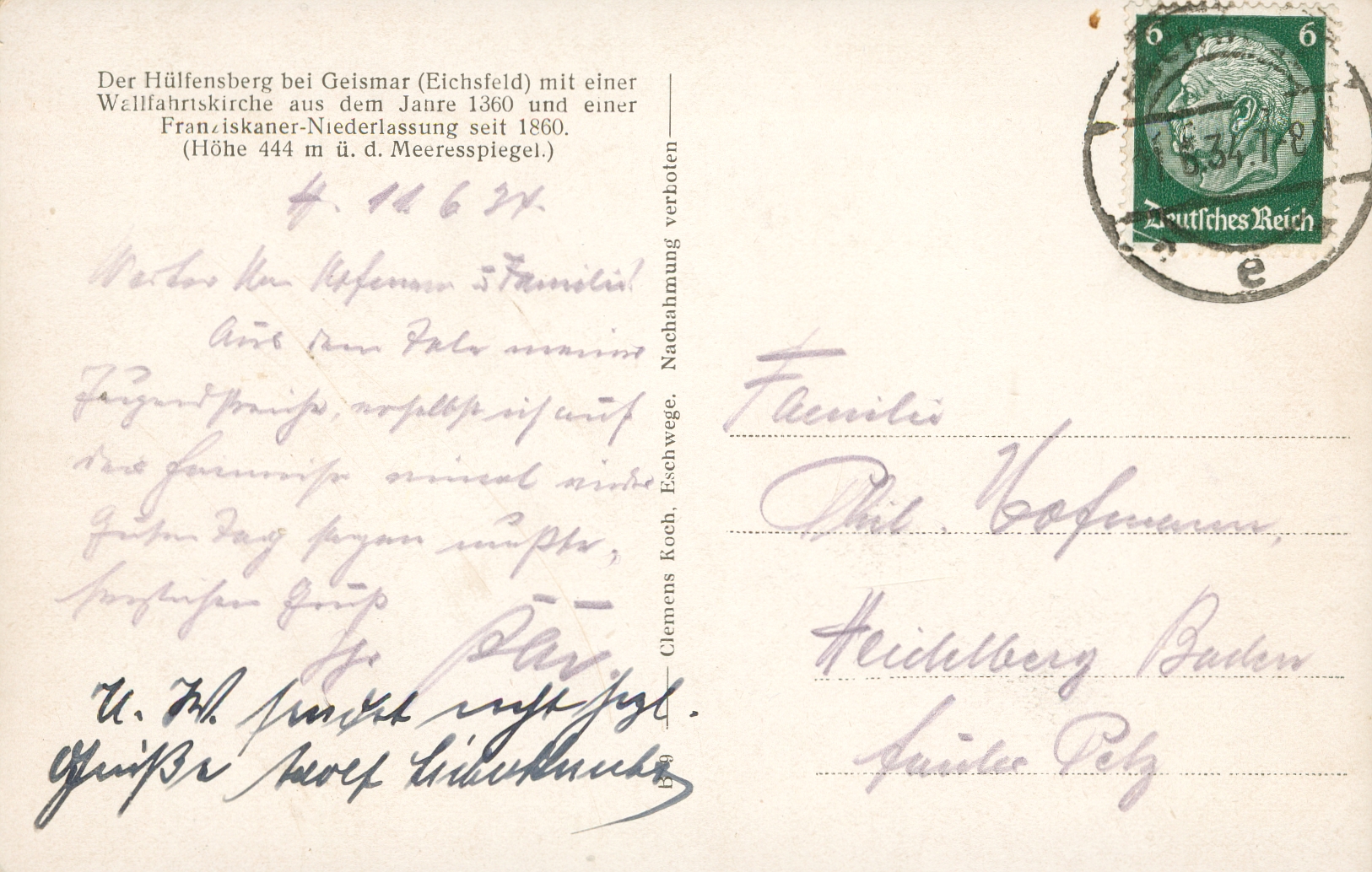 Ort Geismar Beschreibung Sammlung: Oliver KrebsStandort: Gemeindearchiv Lengenfeld unterm Stein Motive Panorama Format klein Jahr 1934 Verlag Clemens Koch, Eschwege Bestell- oder Individualnummer B 9 Versanddatum 11.06.1934
