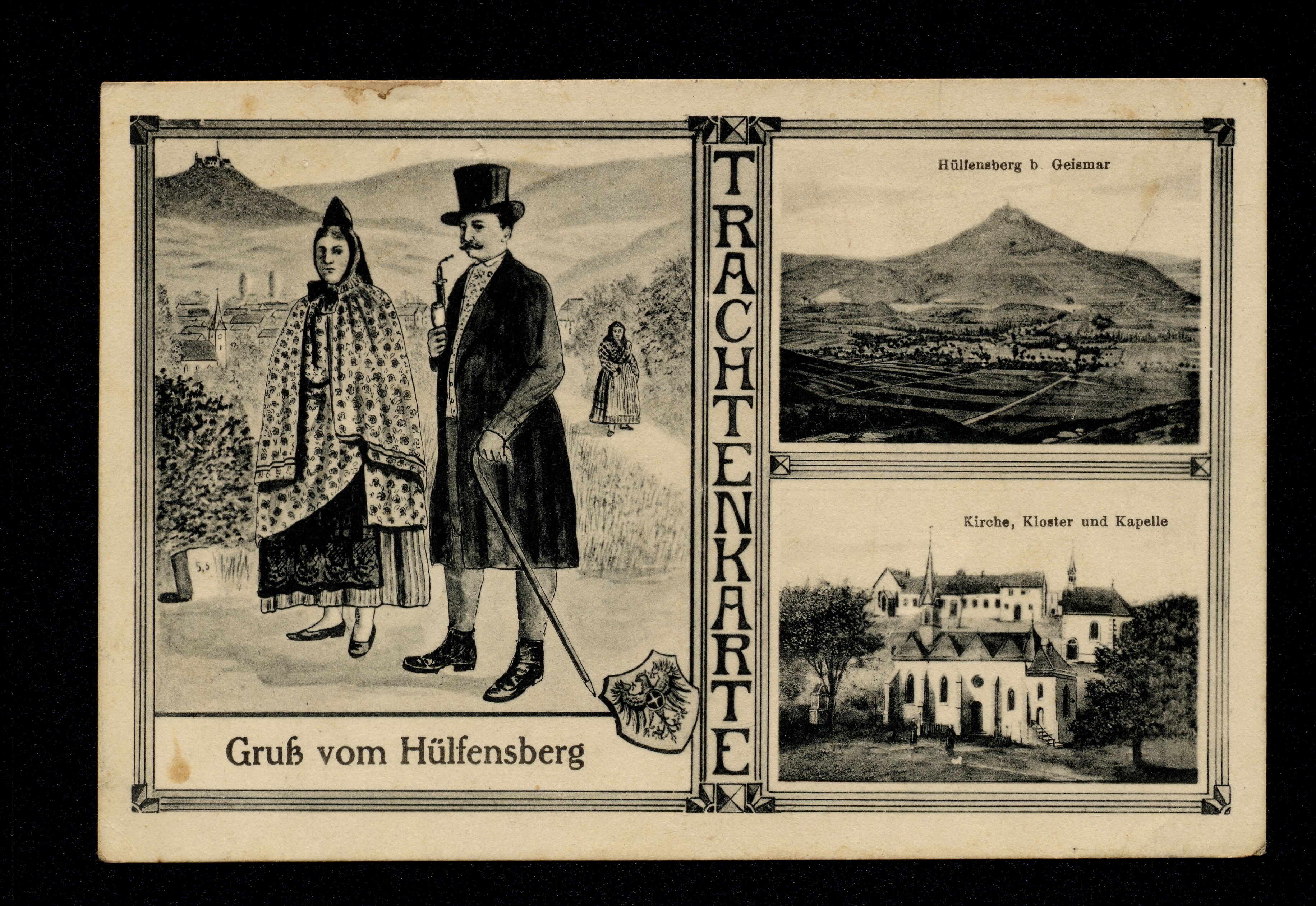 Ort Geismar Motive Trachtenkarte Hülfensberg b. Geismar Kirche, Kloster und Kapelle Format klein Verlag Hugo Wetzel, Witwe, Dingelstädt Bestell- oder Individualnummer 7070 O. D. Tags Volkstracht Tabakspfeiffe
