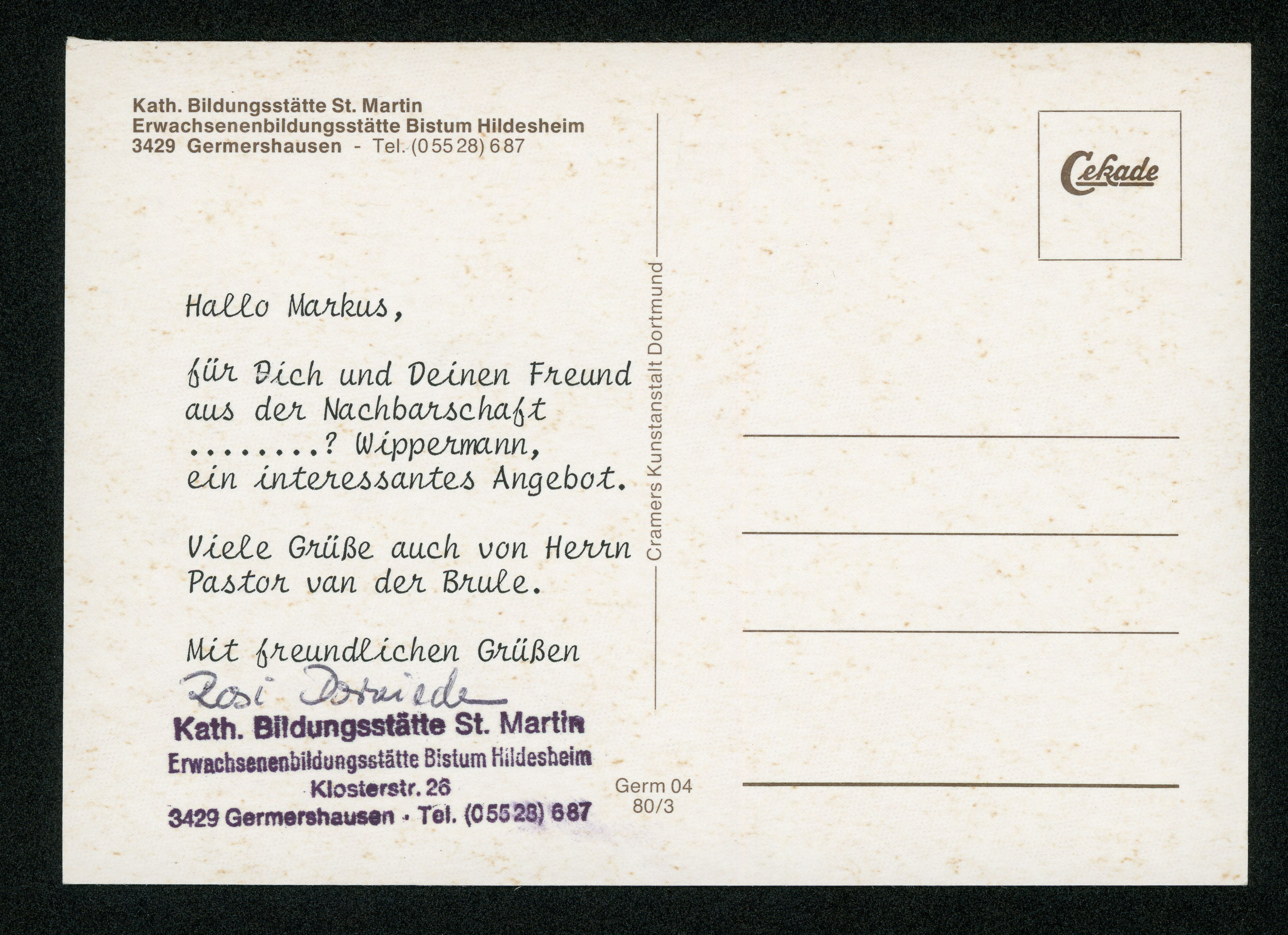 Ort Germershausen Motive Kath. Bildungsstätte St. Martin, Erwachsenenbildungsstätte Bistum Hildesheim Format groß Jahr 1980 Verlag Cramers Kunstanstalt, Dortmund Bestell- oder Individualnummer Germ 04 80/3