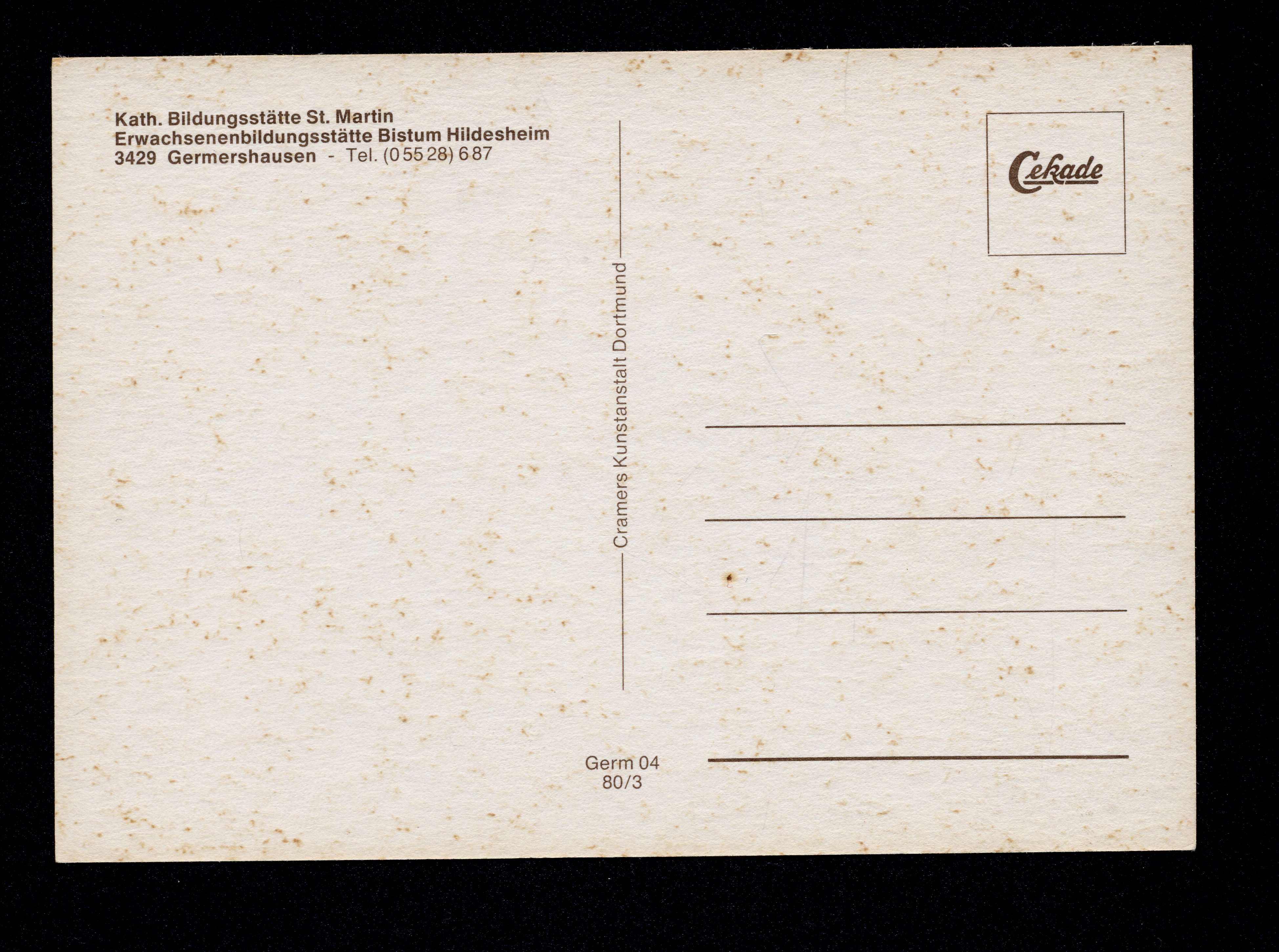 Ort Germershausen Motive Kath. Bildungsstätte St. Martin, Erwachsenenbildungsstätte Bistum Hildesheim Format groß Jahr 1980 Verlag Cramers Kunstanstalt, Dortmund Bestell- oder Individualnummer Germ 04 80/3