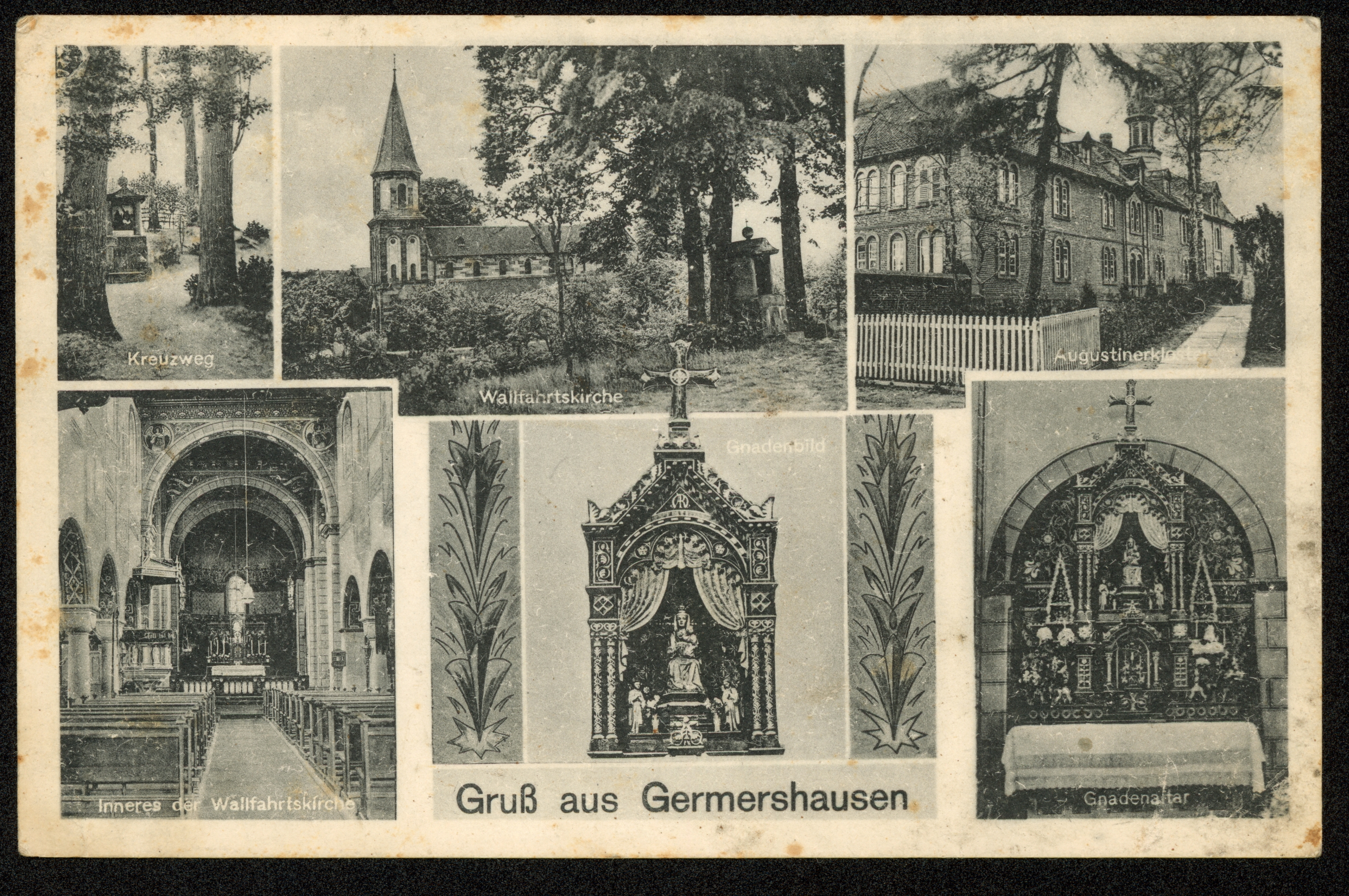 Ort Germershausen Motive Kreuzweg Wallfahrtskirche Augustinerkloster Inneres der Wallfahrtskirche Gnadenbild Gnadenaltar Format klein Verlag Gebrüder Seseke, Duderstadt Bestell- oder Individualnummer Nr. 164 B 40 Tags Landpoststempel