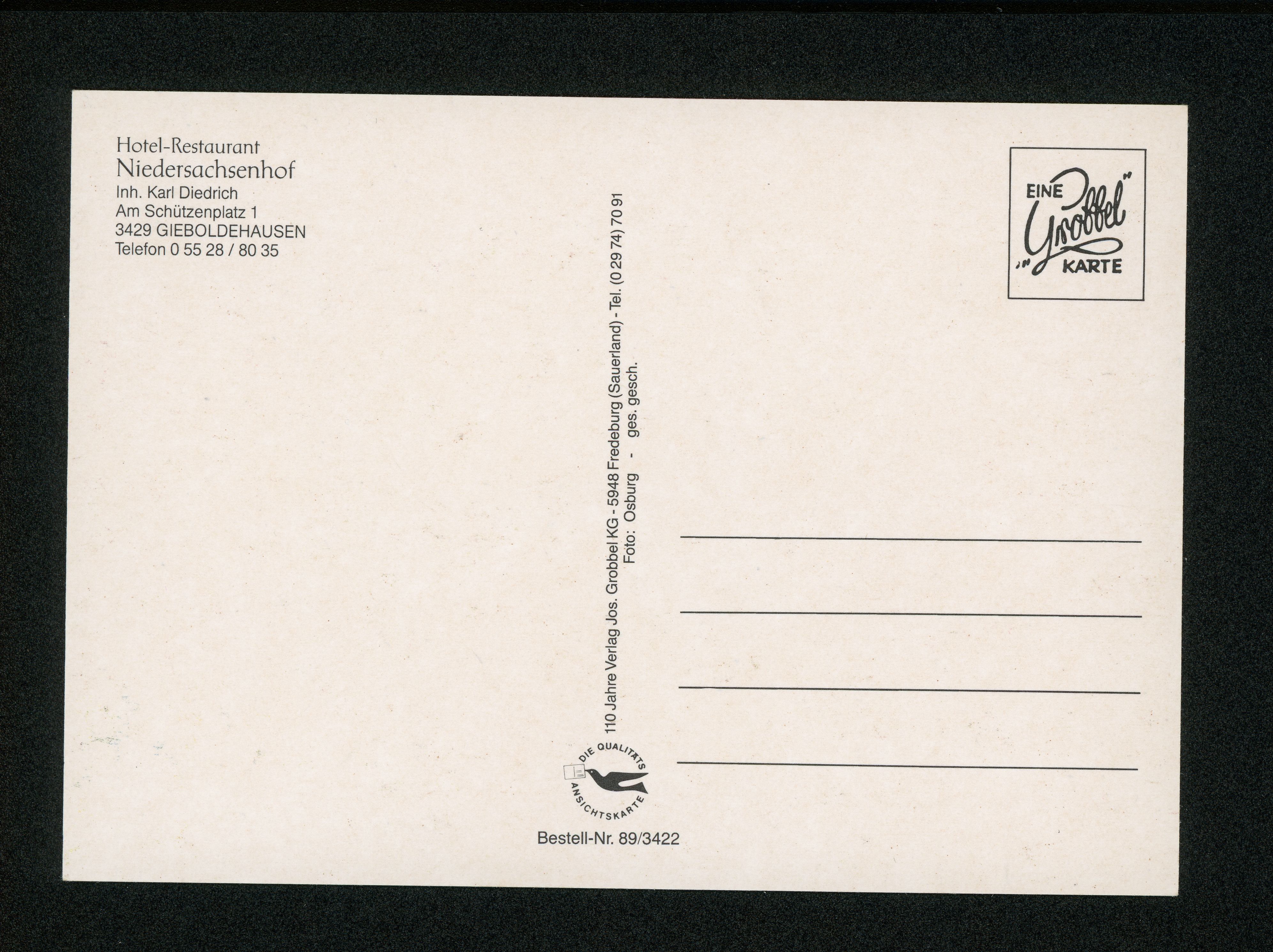 Ort Gieboldehausen Motive Hotel-Restaurant Niedersachsenhof Inh. Karl Diedrich Format groß Verlag Jos. Grobbel, Fredeburg Sauerland Bestell- oder Individualnummer Bestell-Nr. 89/3422 Tags Gasthaus