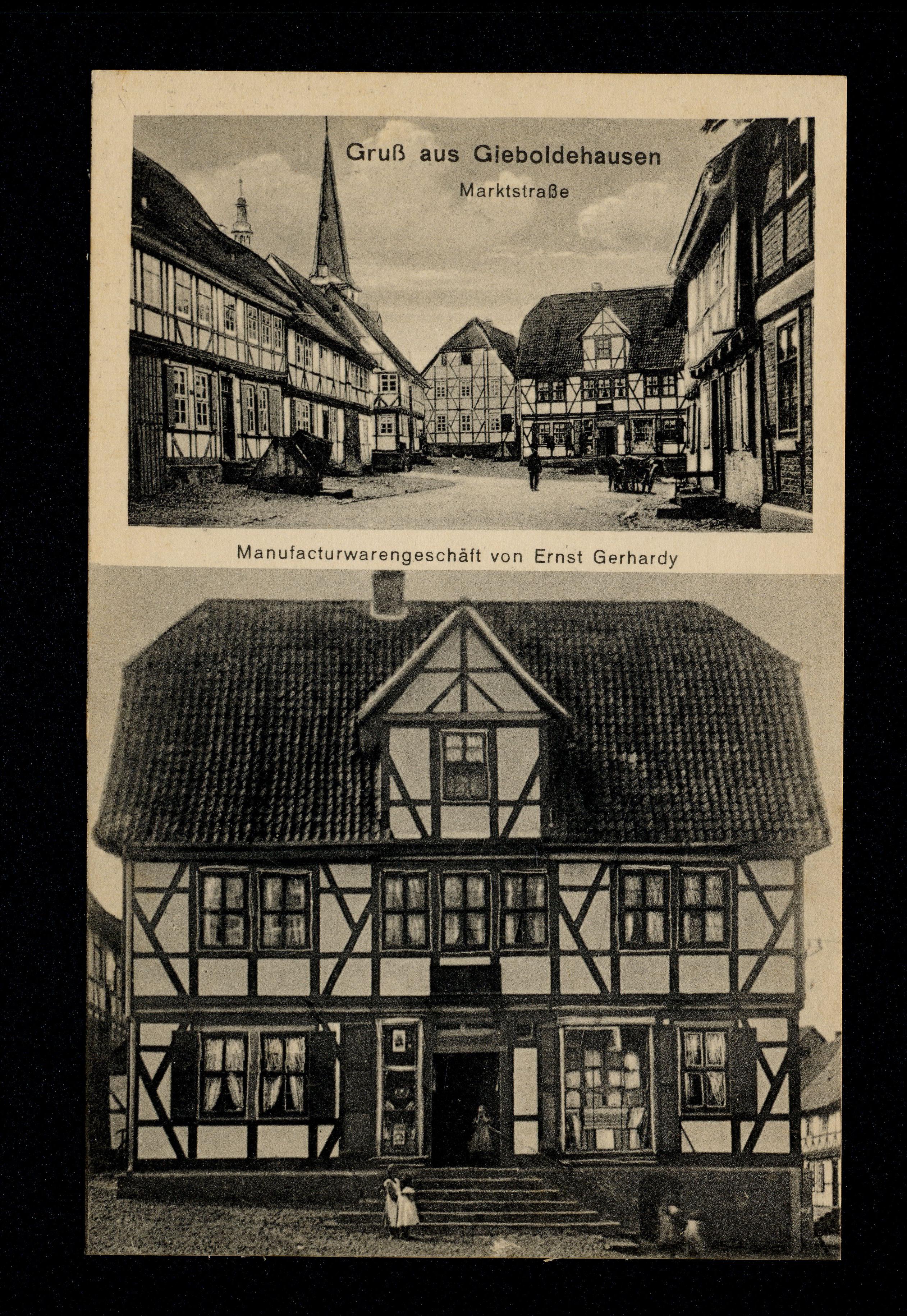 Ort Gieboldehausen Motive Marktstraße Manufacturwarengeschäft von Ernst Gerhardy Format klein Verlag J. Neulen, Alfeld Leine Bestell- oder Individualnummer 4509 Tags Manufacturwarengeschäft Ernst Gerhardy Manufakturwaren