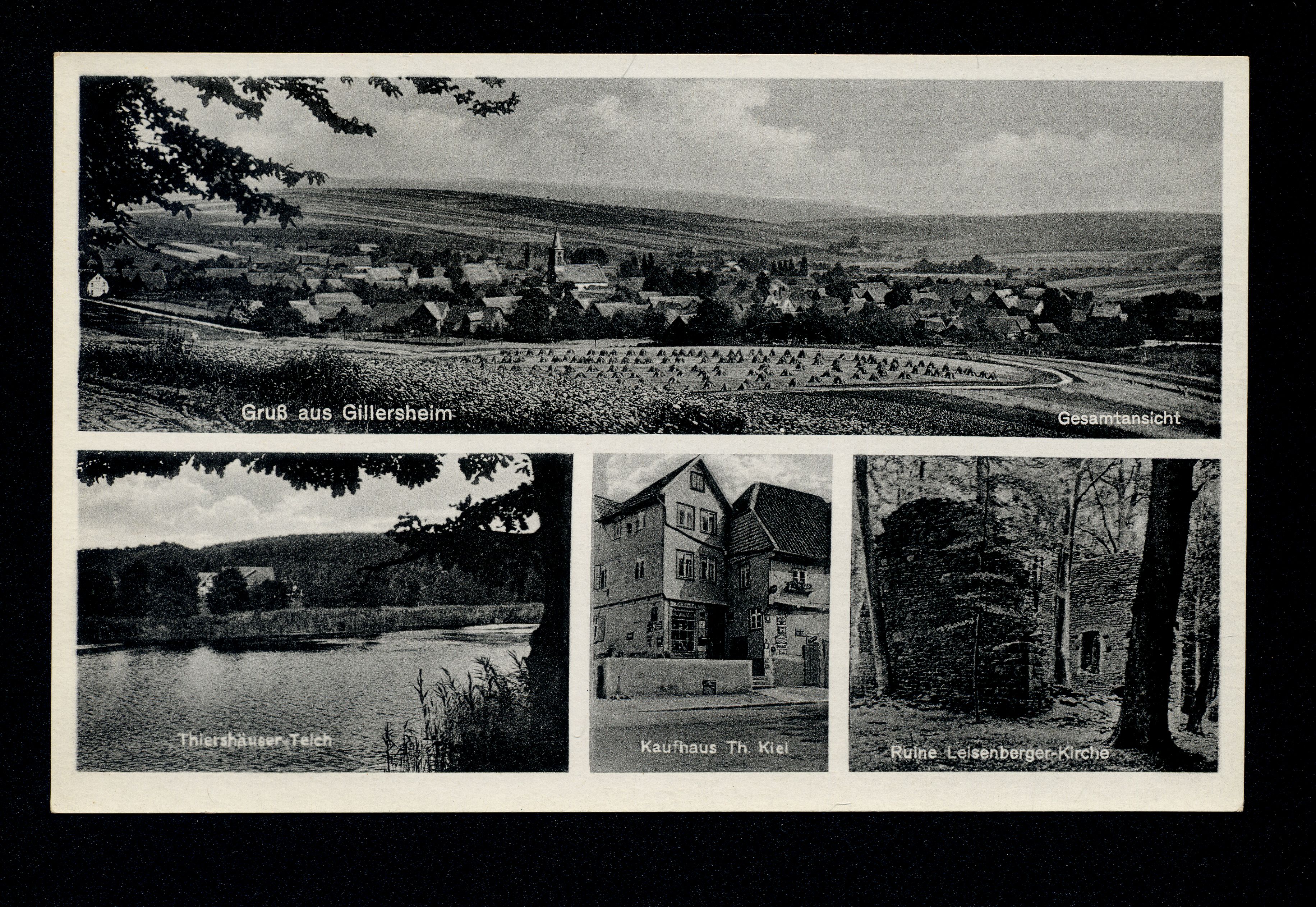 Ort Gillersheim Motive Gesamtansicht Thiershäuser Teich Kaufhaus Th. Kiel Ruine Leisenberger-Kirche Format klein Verlag Gebrüder Seseke, Duderstadt Bestell- oder Individualnummer Nr. 252 a 6 Tags Thiershäuser Teiche Groß Thiershausen