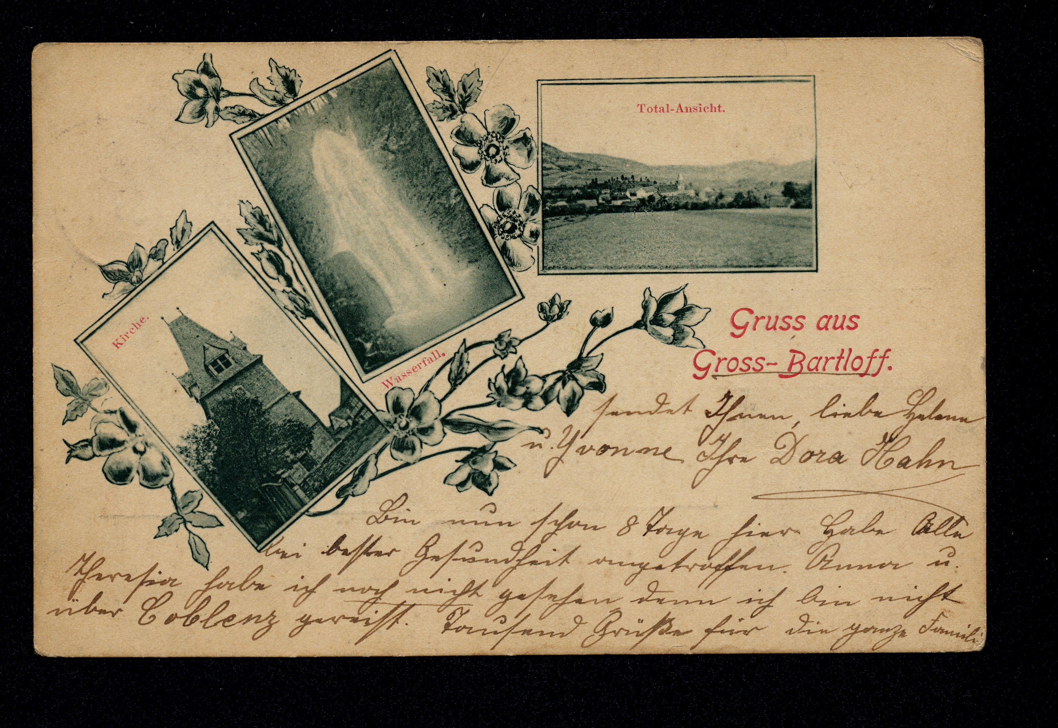 Ort Großbartloff Motive Kirche Wasserfall Total-Ansicht Format klein Jahr 1906 Bestell- oder Individualnummer - Versanddatum 06.06.1906