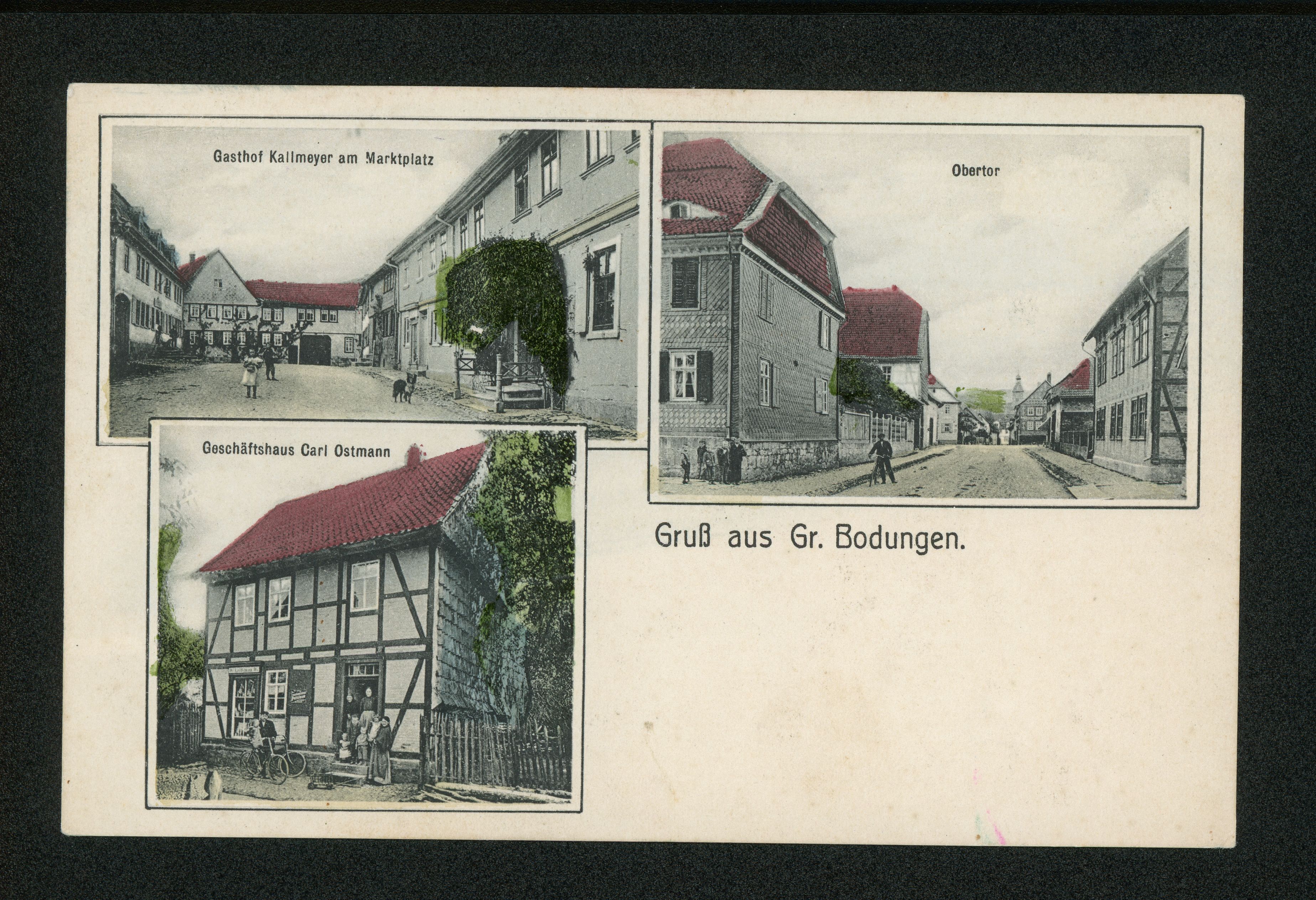 Ort Großbodungen Motive Gasthof Kallmeyer am Marktplatz Obertor Geschäftshaus Carl Ostmann Format klein Jahr 1907 Verlag Rolf & Co., Hannover Bestell- oder Individualnummer 7541 Tags Gasthaus Kirchblick