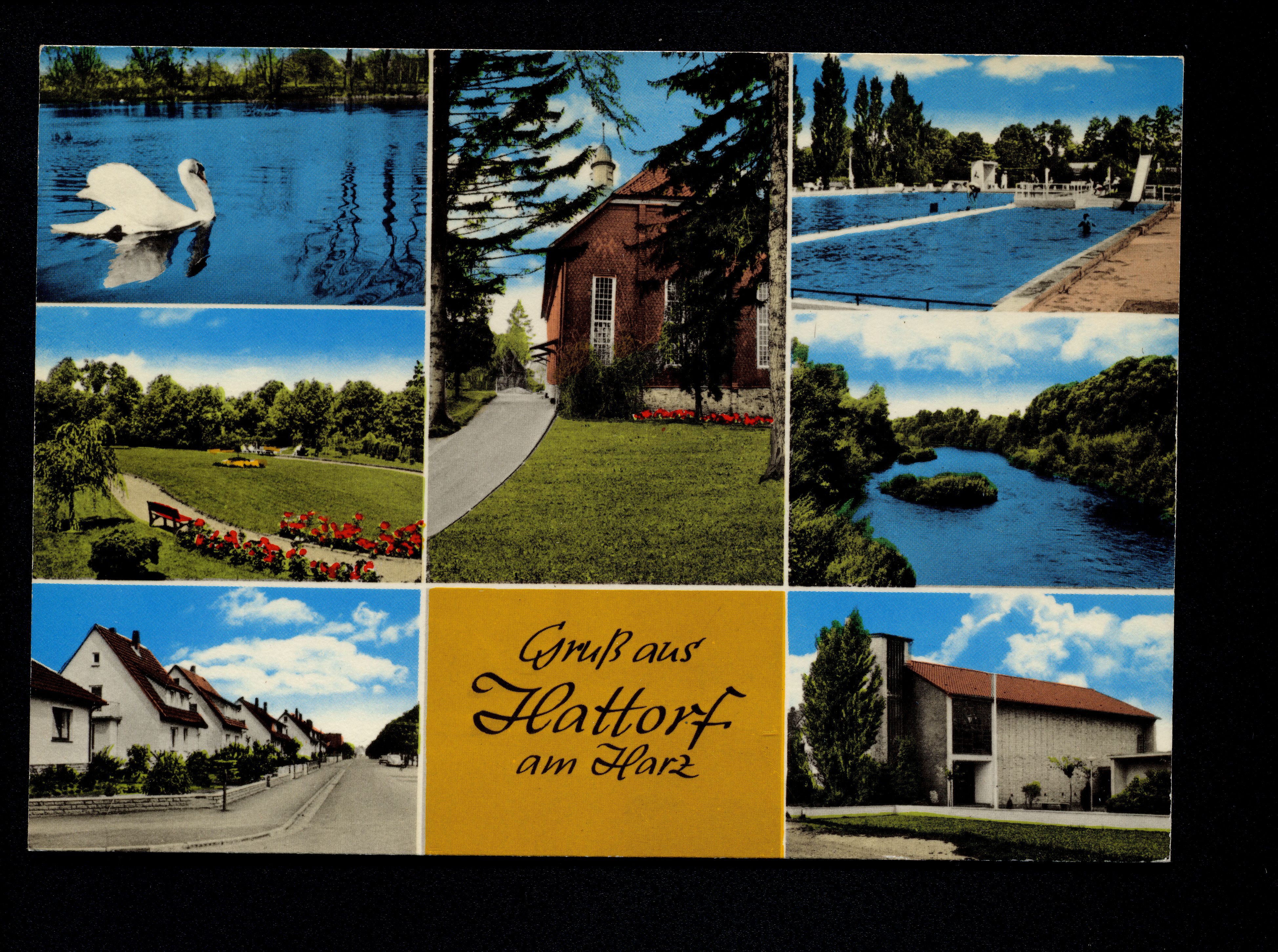 Ort Hattorf Motive Schwan Park Straßenansicht Freibad Sieber St. Hildegard Kirche Format groß Verlag Carl Thoericht, Hann.-Münden (Karl Thoericht) (CTM) Bestell- oder Individualnummer CTM 27226 180/II/2