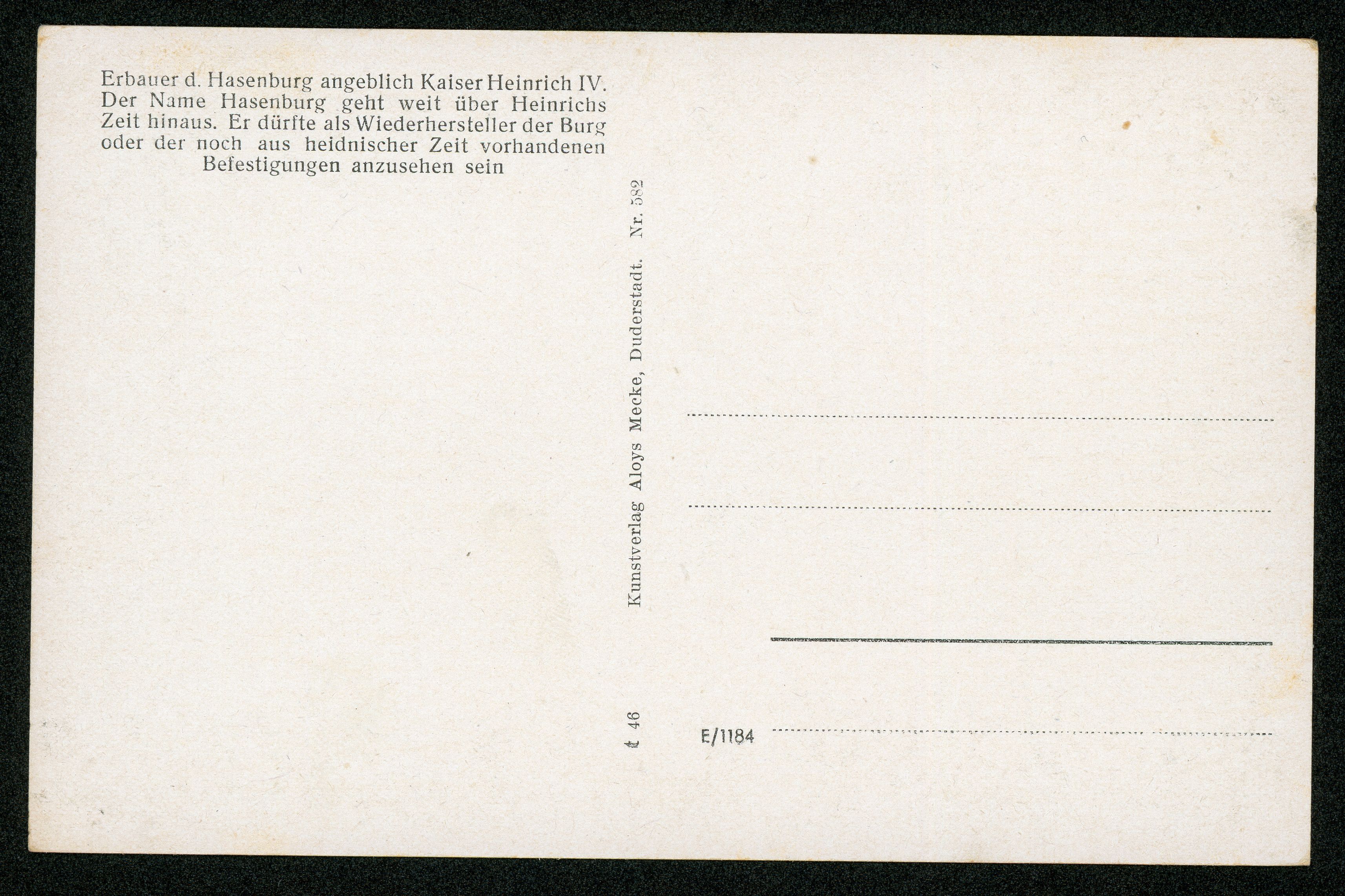 Ort Haynrode - Belege Beschreibung Sammlung: H.M.D. Motive Hasenburg (Ehemalige Wallburg) Format klein Verlag Aloys Mecke, Duderstadt Bestell- oder Individualnummer Nr. 582 t 46