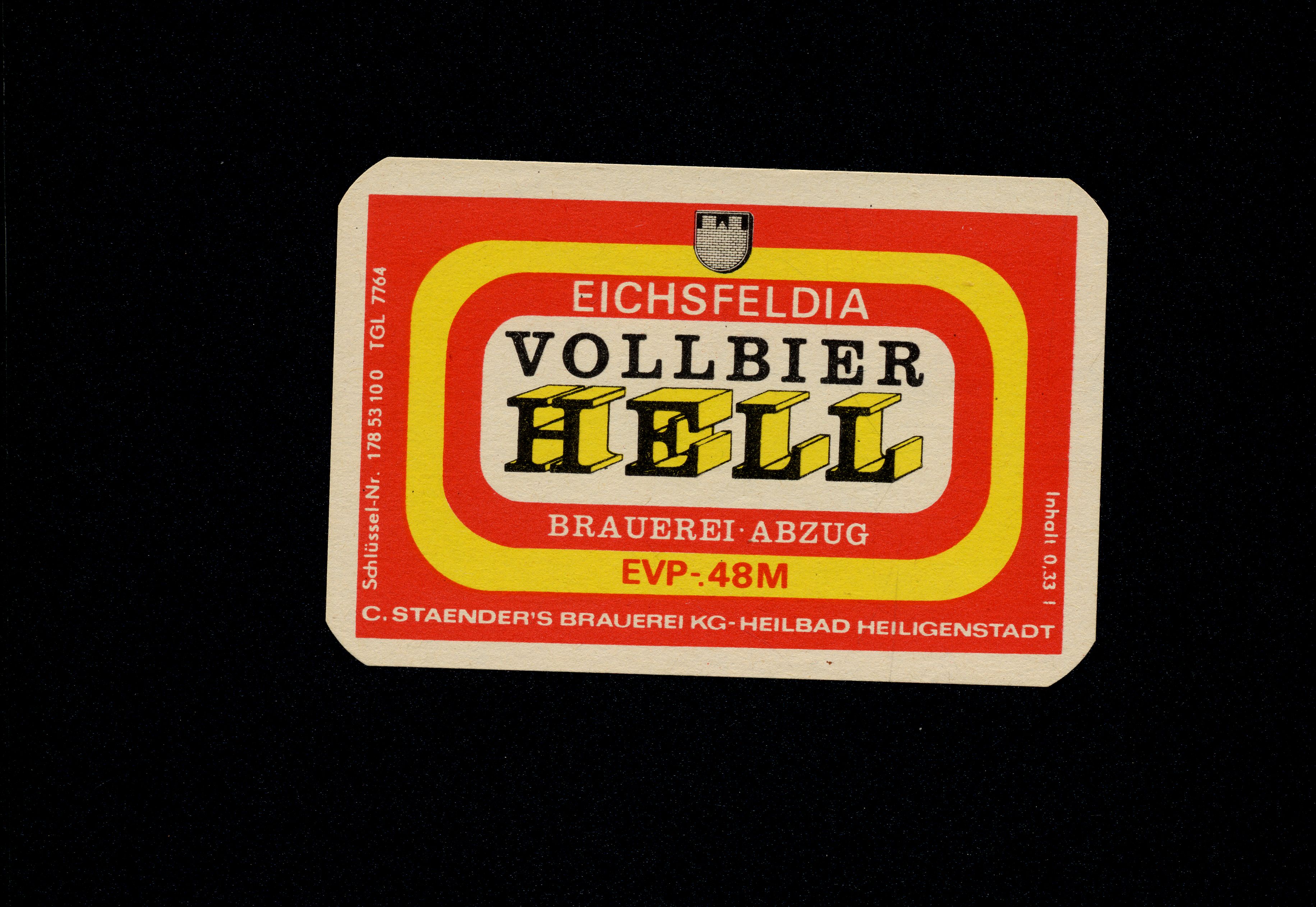 Ort Heiligenstadt - Belege Beschreibung Flaschenetikett Motive Eichsfeldia Vollbier Hell C. Staender's Brauerei Format Sonderformat Verlag - Bestell- oder Individualnummer Schlüssel-Nr. 178 53 10 0 TGL 7764