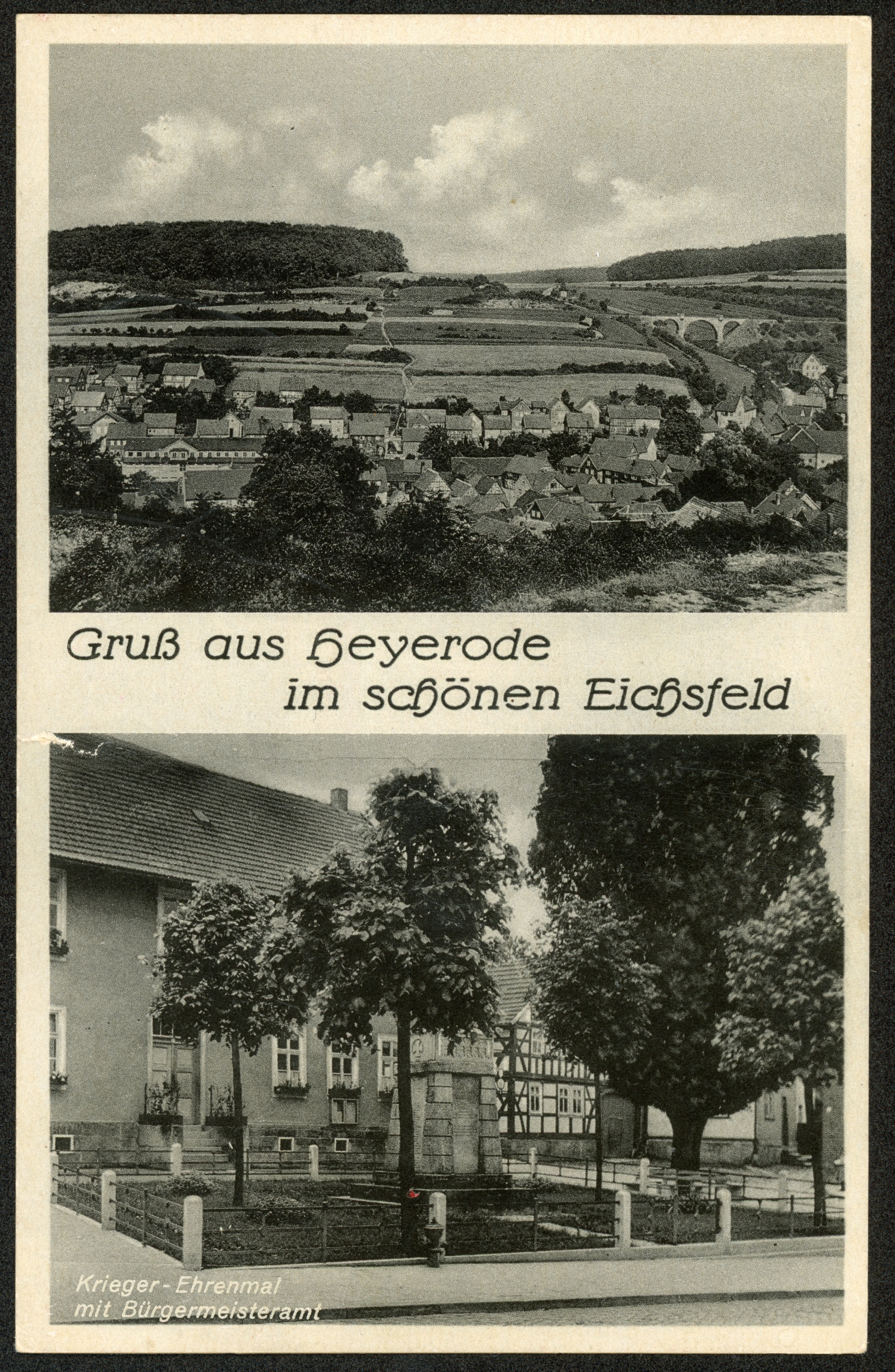 Ort Heyerode Motive Panorama Krieger-Ehrenmal mit Bürgermeisteramt Format klein Verlag Walter Osburg, Heyerode (Obereichsf.) Bestell- oder Individualnummer 33130 Tags Kriegerdenkmal