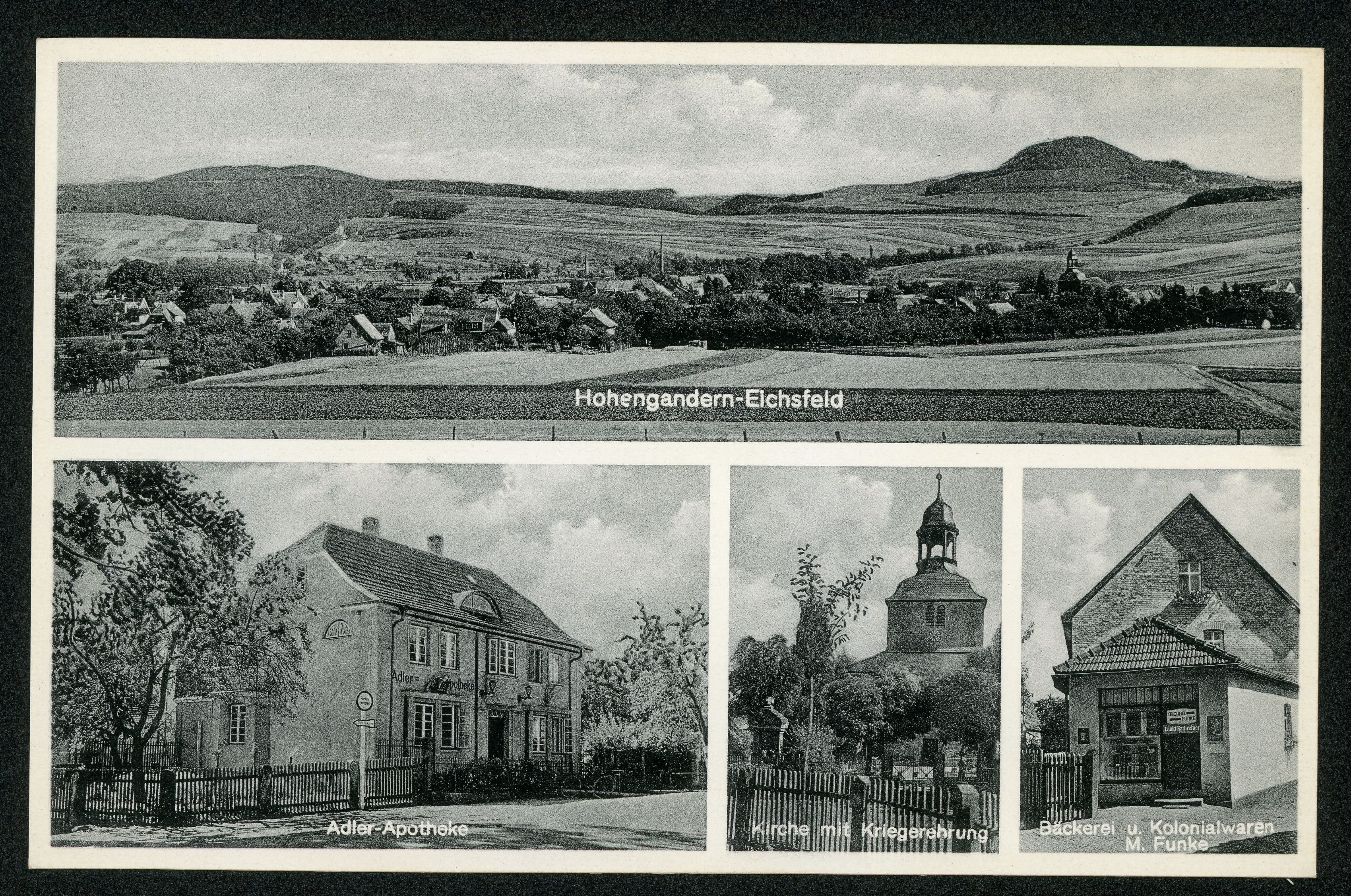 Ort Hohengandern Motive Panorama Adler-Apotheke Kirche mit Kriegerehrung Bäckerei u. Kolonialwaren M. Funke Format klein Verlag Aloys Mecke, Duderstadt Bestell- oder Individualnummer Nr. 697 E 98 Tags Kriegerdenkmal