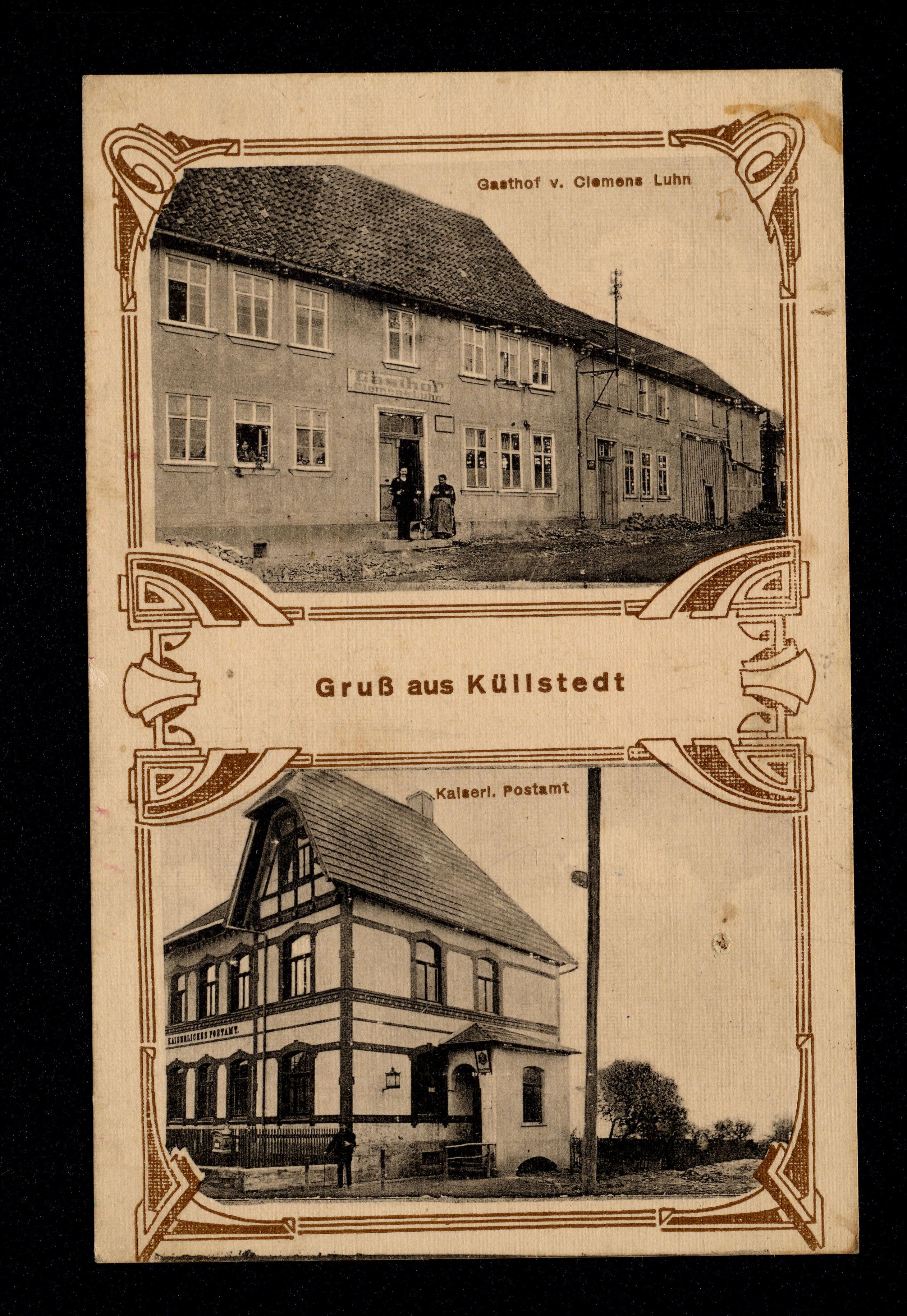 Ort Küllstedt Beschreibung Variante "braun" Motive Gasthof v. Clemens Luhn Kaiserl. Postamt Format klein Verlag Feodor Curdts, Erfurt Bestell- oder Individualnummer p 64 Tags Gasthaus