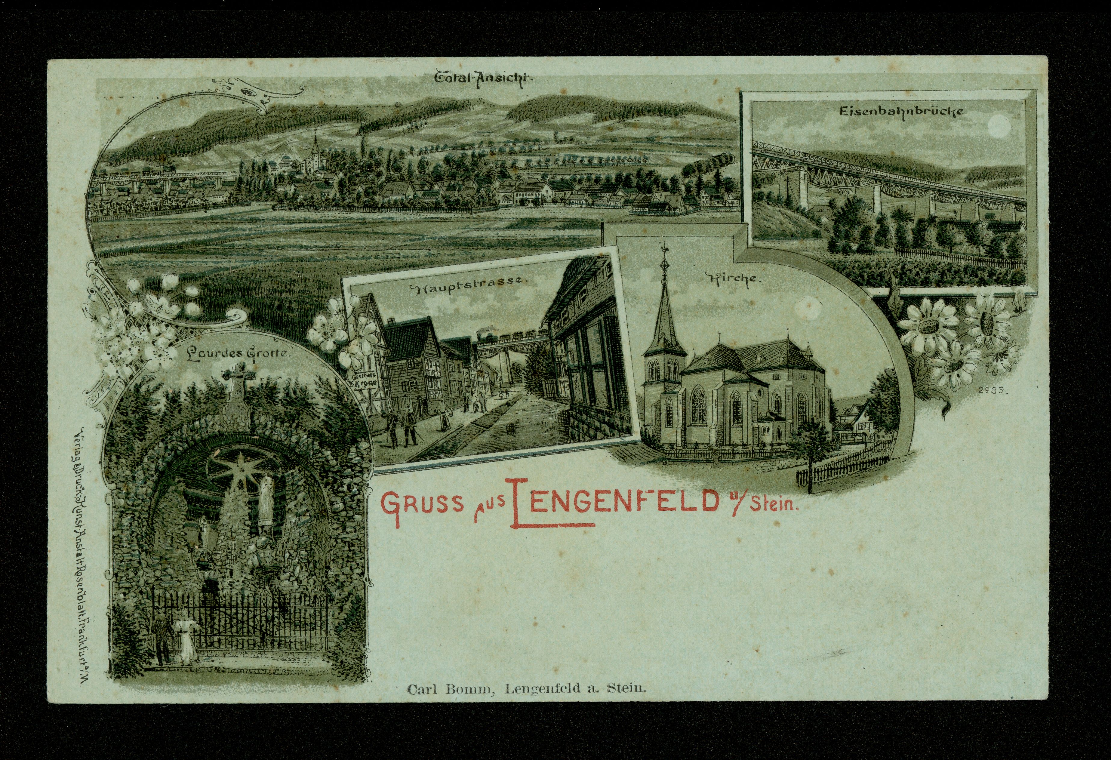 Ort Lengenfeld unterm Stein Beschreibung Variante "einfarbig" und "Verlag" Motive Total-Ansicht Lourdes Grotte Hauptstrasse Kirche Eisenbahnbrücke Format klein Verlag Rosenblatt, Frankfurt a/M. Bestell- oder Individualnummer 2985 Tags Eisenbahn