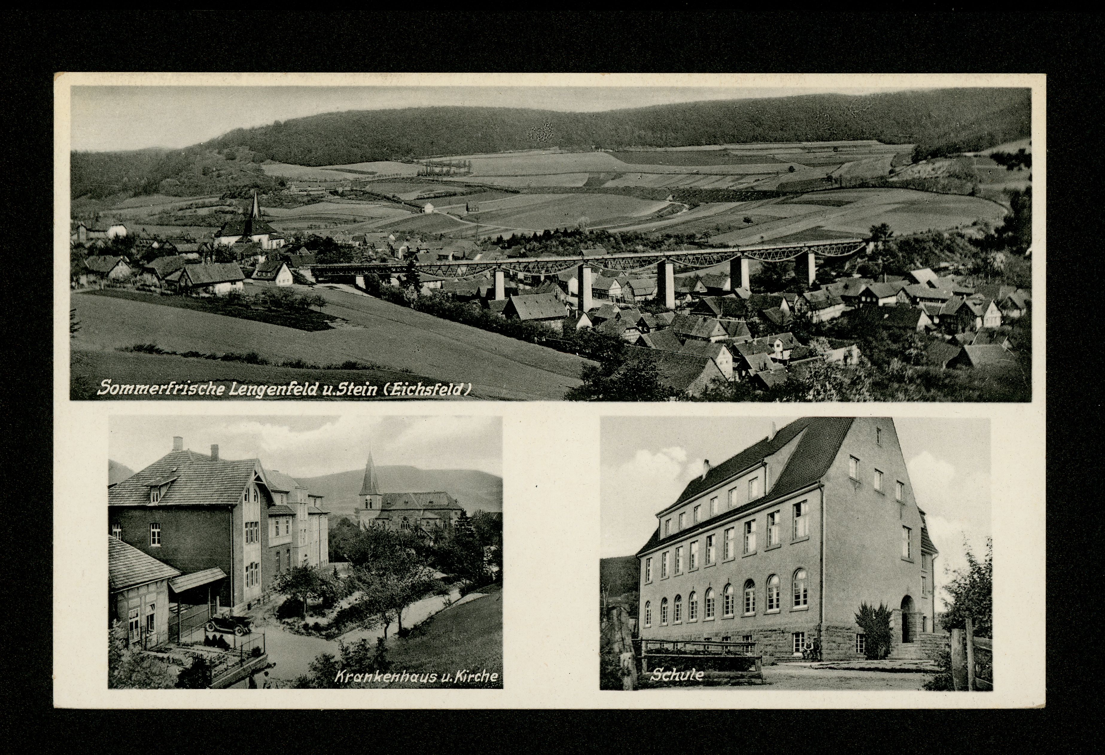 Ort Lengenfeld unterm Stein Motive Panorama Krankenhaus u. Kirche Schule Format klein Verlag Heinrich Hardegen, Lengenfeld u. Stein Bestell- oder Individualnummer 14746 734 RD 454872