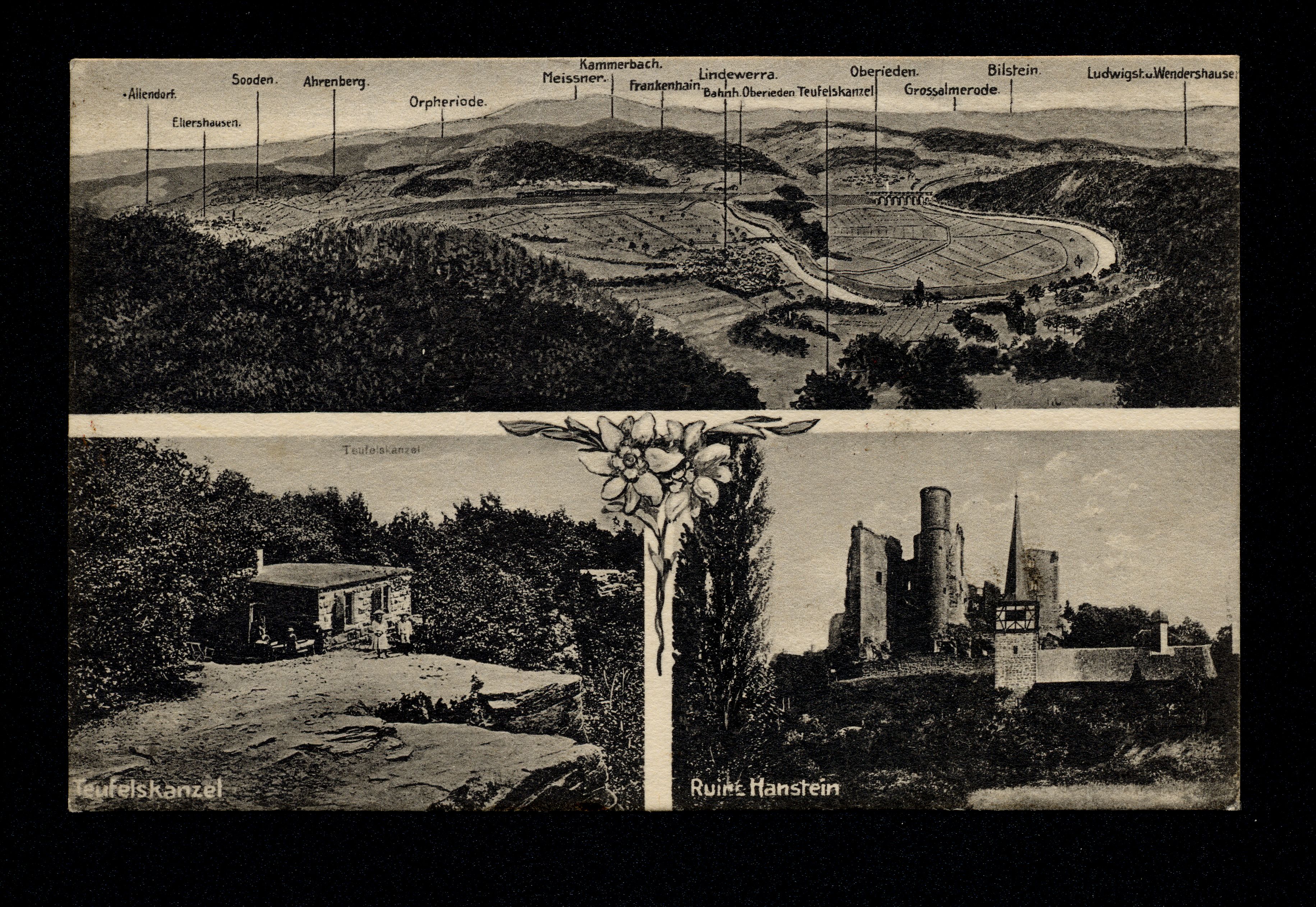 Ort Lindewerra Motive Teufelskanzel Ruine Hanstein Allendorf Ellershausen Sooden Ahrenberg Orpheriode Meissner Kammerbach Frankenhain Lindewerra Bahnh. Oberrieden Oberrieden Grossalmerode Bilstein Ludwigst. u. Wendershausen Format klein Verlag Fischer's Kunstanstalt, Allendorf a. d. W. Bestell- oder Individualnummer 4498 Tags Werraschleife Bornhagen Ludwigstein Bahnhof Orferode