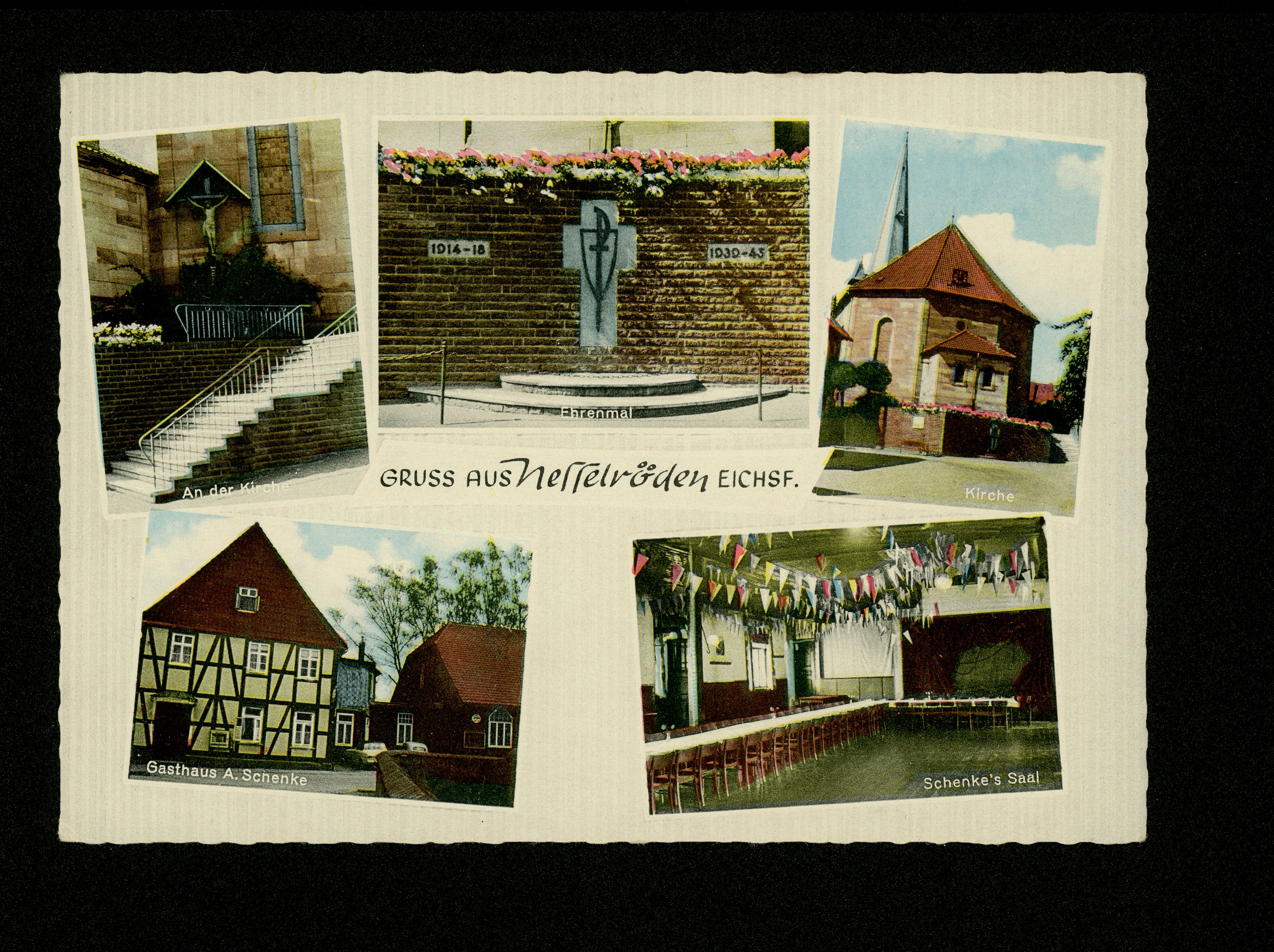 Ort Nesselröden Motive An der Kirche Ehrenmal Kirche Gasthaus A. Schenke Schenke' Saal Format groß Verlag Gebrüder Seseke, Duderstadt Bestell- oder Individualnummer Nr. 641 E13 Tags Kriegerdenkmal