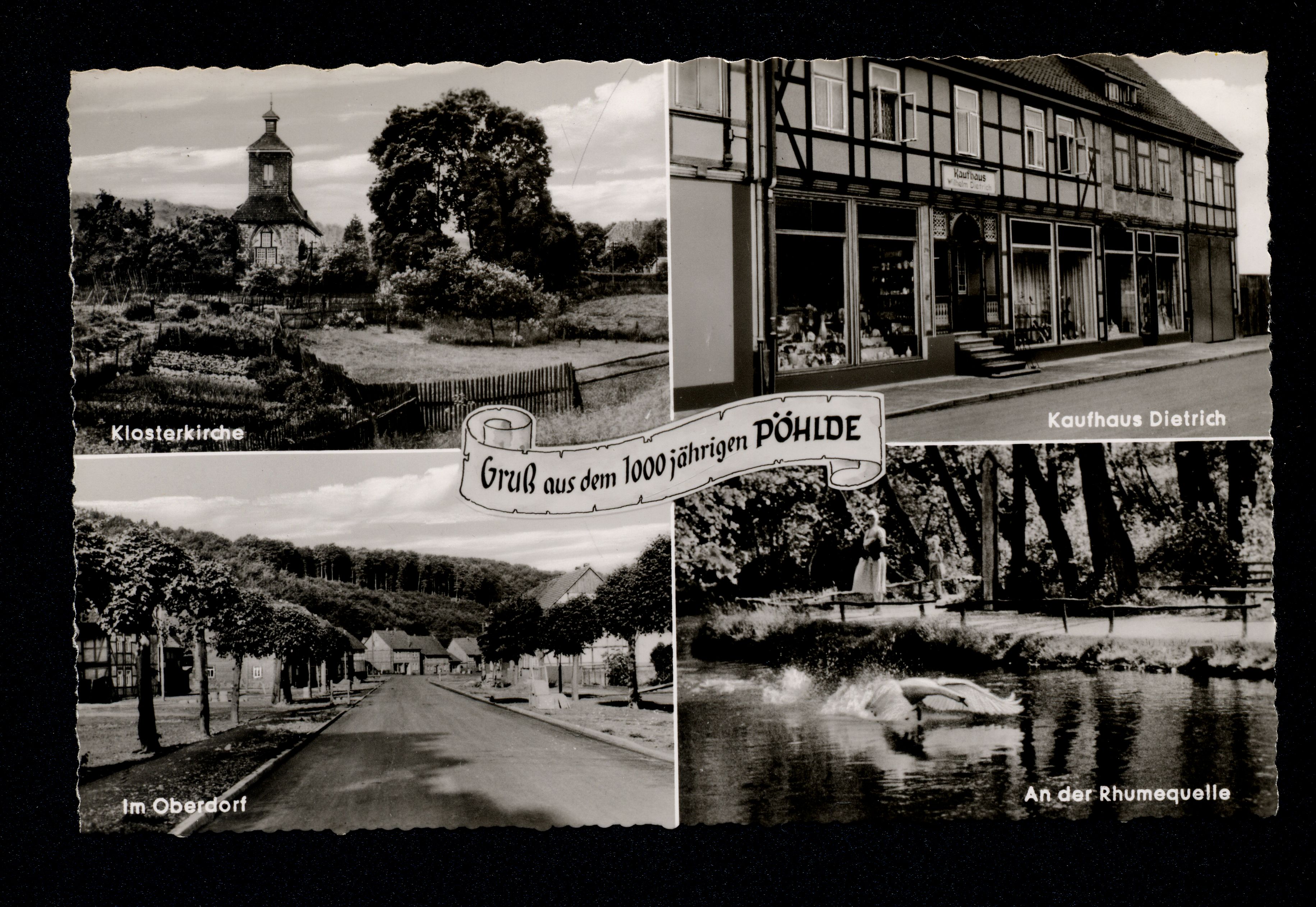 Ort Pöhlde Motive Klosterkirche Im Oberdorf An der Rhumequelle Kaufhaus Dietrich Format klein Verlag J. Siegert, Pöhlde Bestell- oder Individualnummer CTM 24363 660/II/3064 BUD Tags Wilhelm Dietrich Rhumspringe