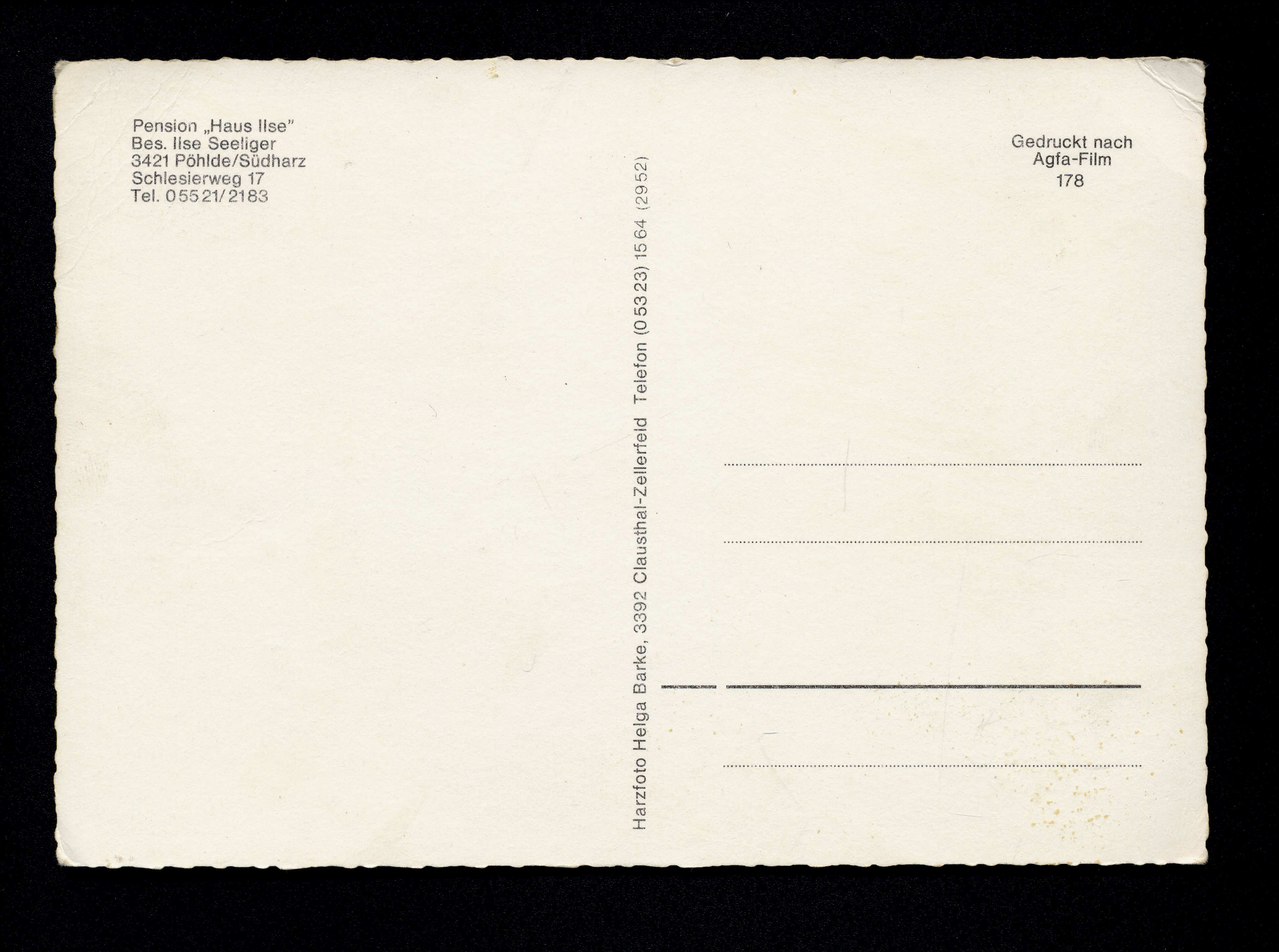 Ort Pöhlde Motive Pension ''Haus Ilse'' Bes. Ilse Seeliger Format groß Verlag Helga Barke, Clausthal-Zellerfeld Bestell- oder Individualnummer 178 Tags Schlesierweg Pension