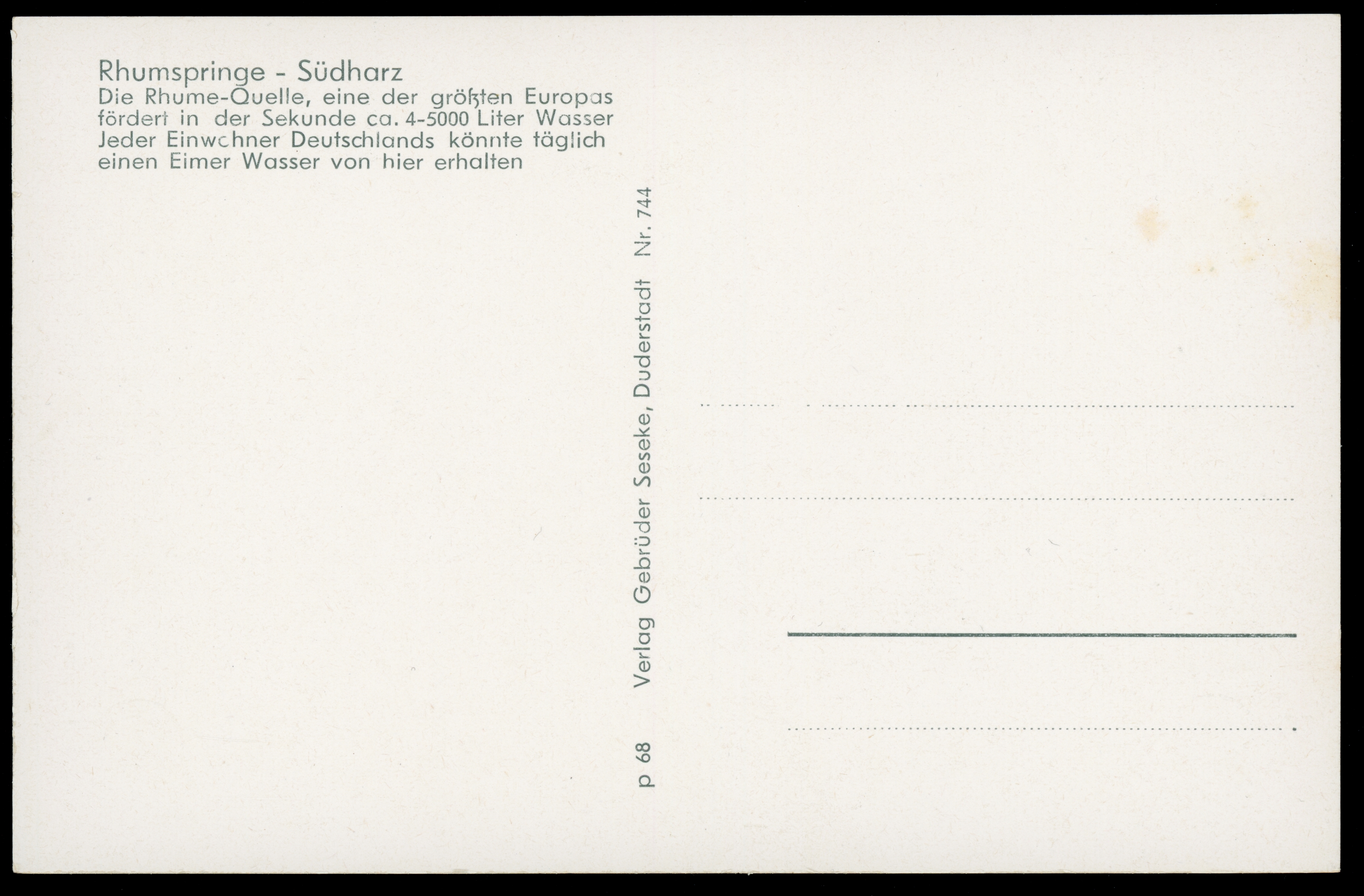 Ort Rhumspringe Motive Rhumequelle Gedicht nach Franz Gleitze - Seeburg Format klein Verlag Gebrüder Seseke, Duderstadt Bestell- oder Individualnummer Nr. 744 p 68